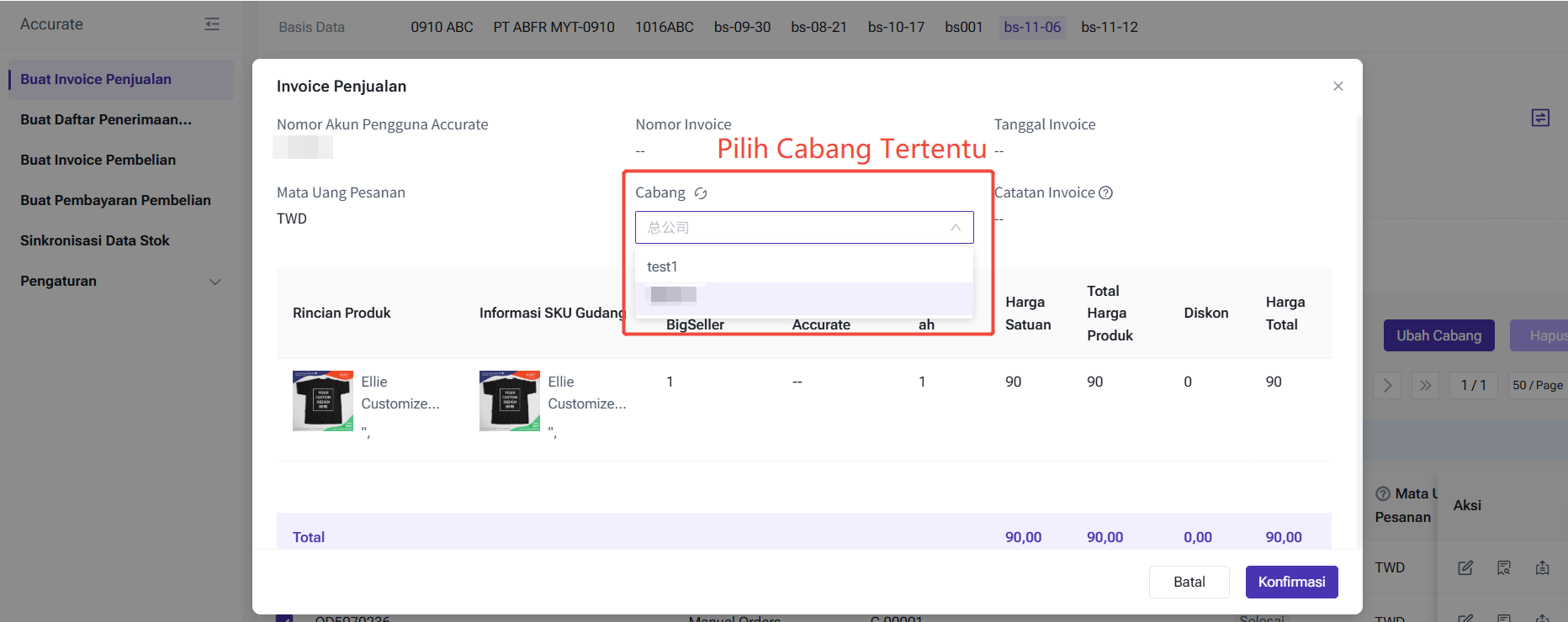 Setelah pemetaan cabang Accurate dilakukan, dan saat push invoice penjualan, daftar penerimaan penjualan, invoice pembelian dan pembayaran pembelian ke Accurate, Anda dapat memilih cabang tertentu secara langsung — tanpa proses manual tambahan!