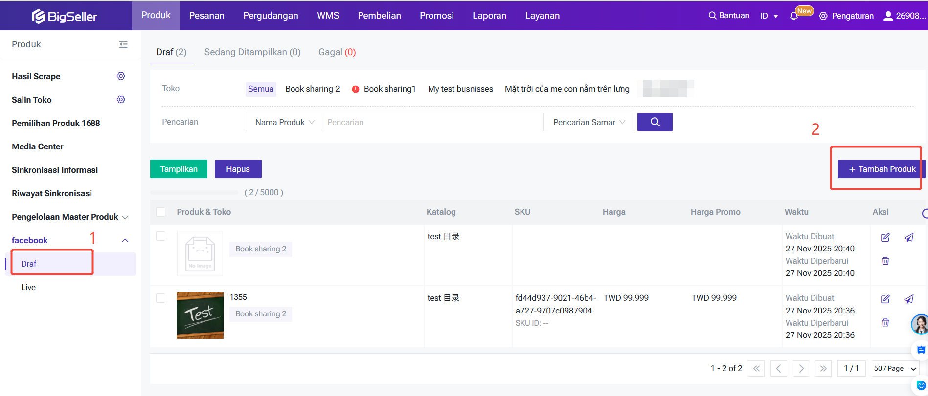 Langkah Pertama, Masuk ke halaman Draf > Klik + Tambah Produk > Pilih Toko dan Daftar Isi