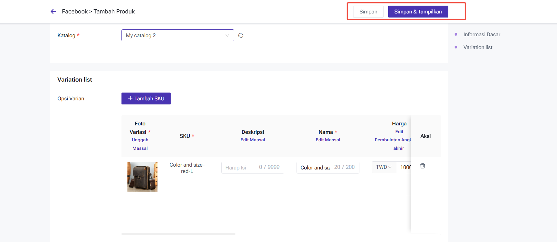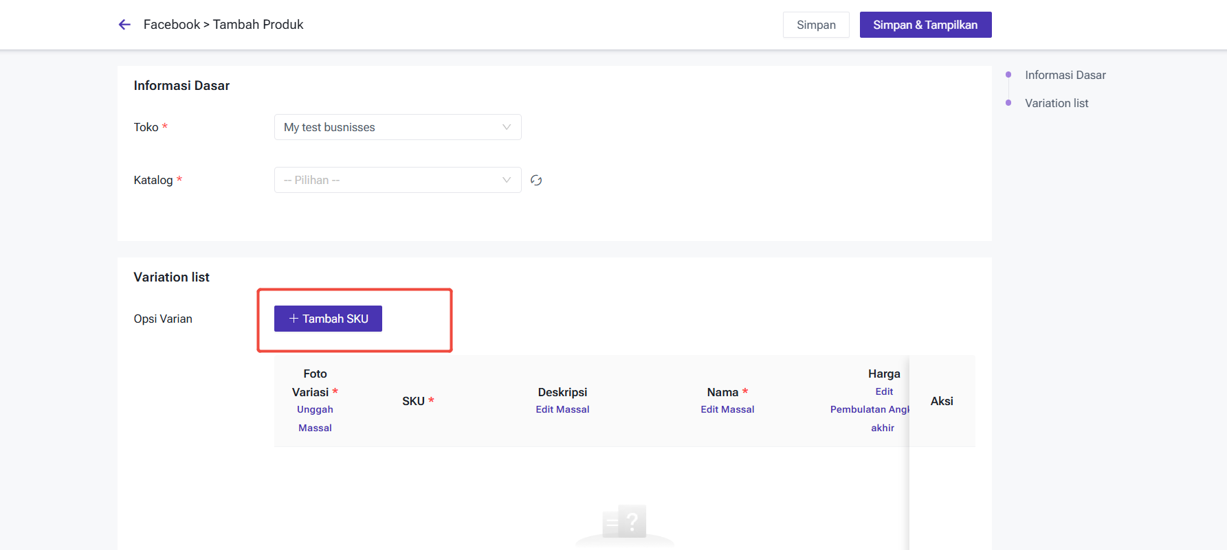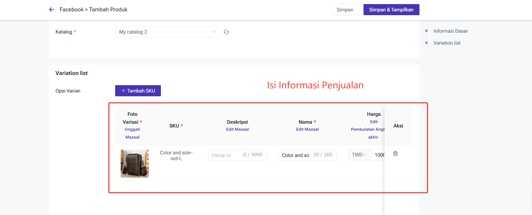Langkah Kedua, Tambah SKU dan lengkapi informasi penjualan.