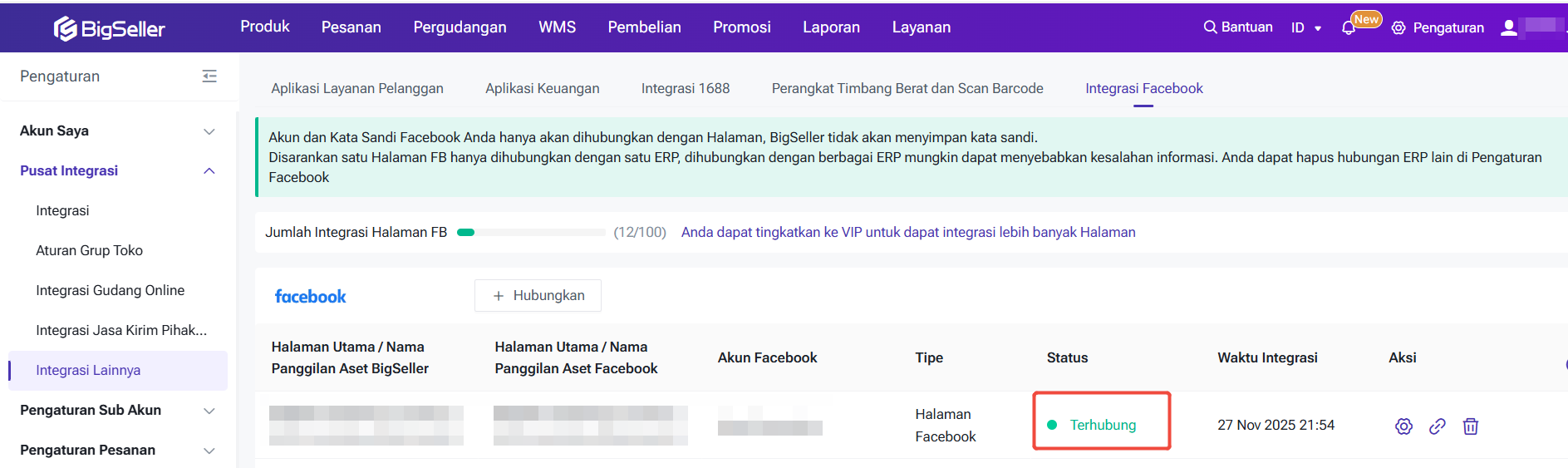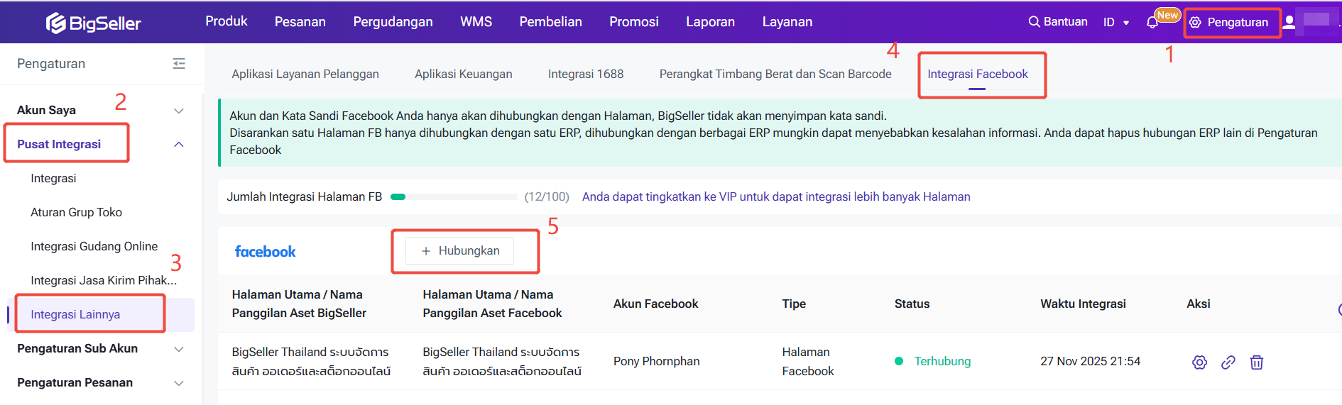 Langkah Pertama, Masuk ke halaman “Integrasi Akun > Integrasi Lainnya > Integrasi Facebook” di BigSeller