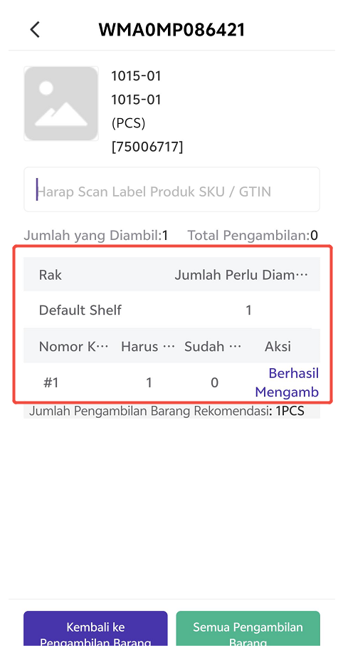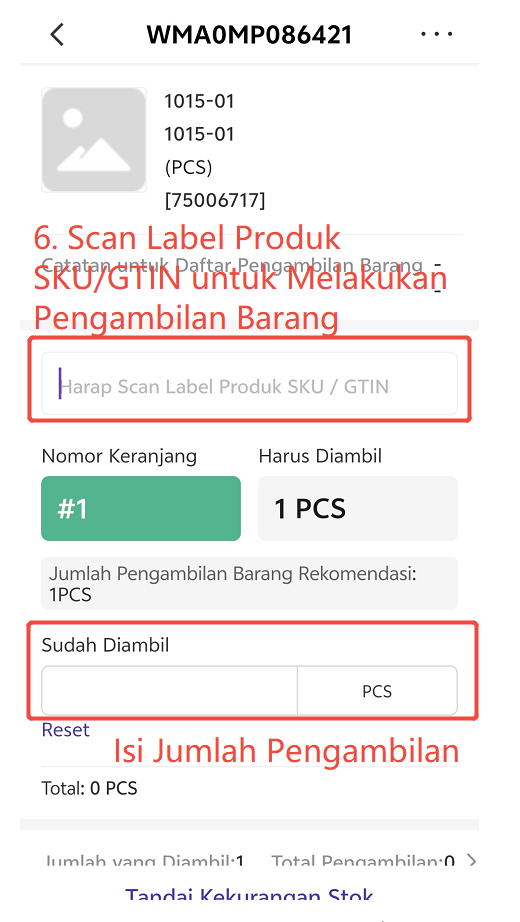 Anda dapat scan SKU Gudang/ GTIN untuk melakukan pengambilan barang, juga dapat masukan jumlah pengambilan produk