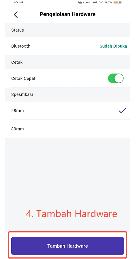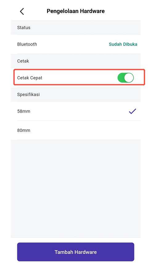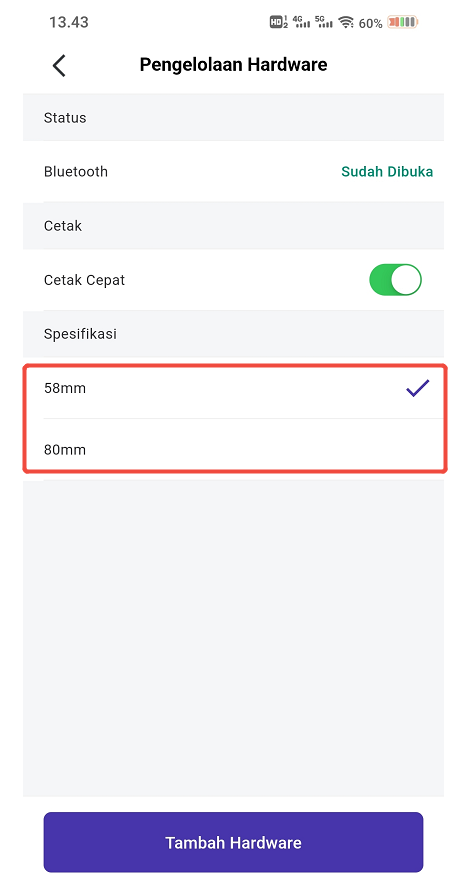 Printer yang Didukung: Saat ini, fitur ini kompatibel dengan sebagian besar printer thermal Bluetooth yang umum digunakan di Asia Tenggara, seperti: Epson TM-T88VII, GPrinter GP-58, dan XPrinter XP-58IIH. Jika Anda mengalami masalah koneksi dengan perangkat Anda, silakan hubungi layanan pelanggan kami.