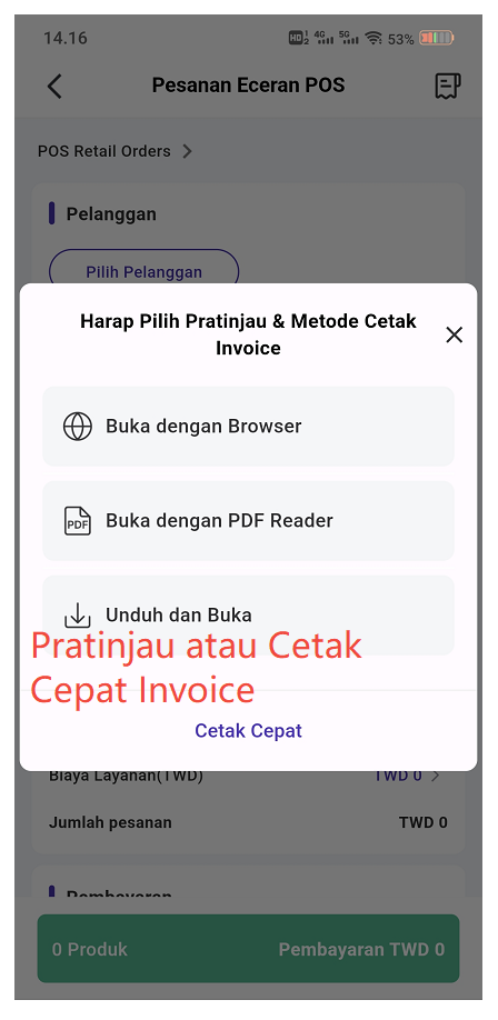 Jika belum aktifkan fitur Cetak Cepat, saat klik "Pembayaran" akan muncul satu pop up, Anda dapat melihat pratinjau dan pilih metode cetak invoice nya.