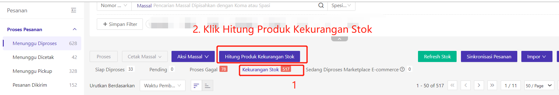 Klik Modul Pesanan > Proses Pesanan > Menunggu Diproses > Kekurangan Stok > Klik Tombol Hitung Produk Kekurangan Stok