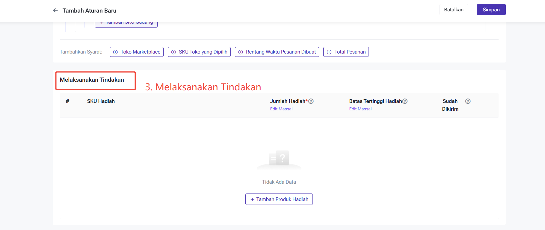 [Rentang Waktu Pesanan Dibuat] : Pengaturan rentang waktu, kalau memenuhi kondisi pengaturan akan tambah produk hadiah secara otomatis