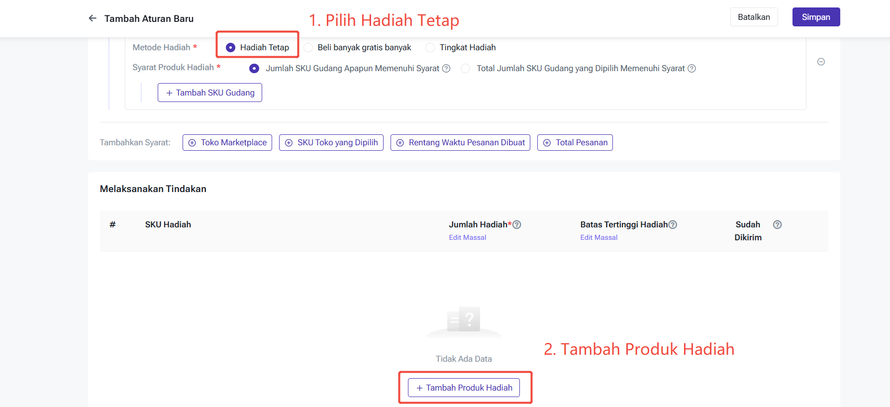 Ketika metode hadiah dipilih sebagai Hadiah Tetap, Anda dapat memilih SKU hadiah (hanya 1 SKU), mengatur jumlah hadiah tetap, serta batas maksimal pemberian hadiah.