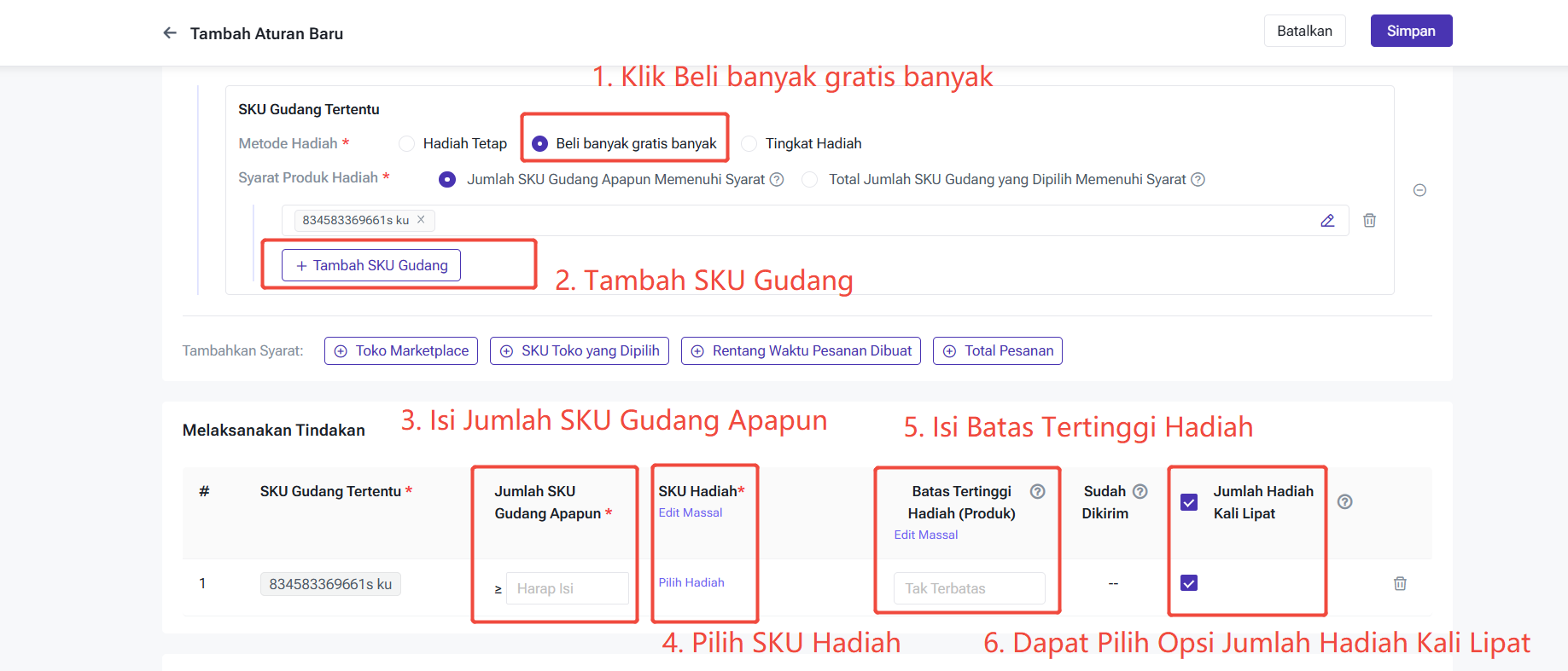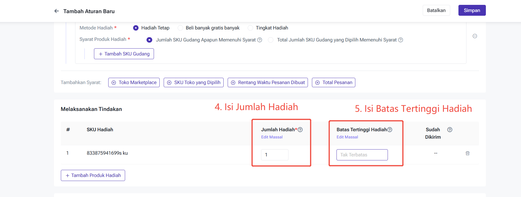 Batas Tertinggi Hadiah: Total Produk Hadiah yang Dapat Diberikan, Setiap Beri Jumlah Produk Hadiah adalah 1 Produk. Jika Tidak Diisi, Maka Jumlah Tak Terbatas, Jika Melebihi Total, Sistem Tidak Akan Otomatis Tambah SKU Hadiah Lagi, Pesanan Dibatalkan Tetap akan Mengurangi Total Produk Hadiah.