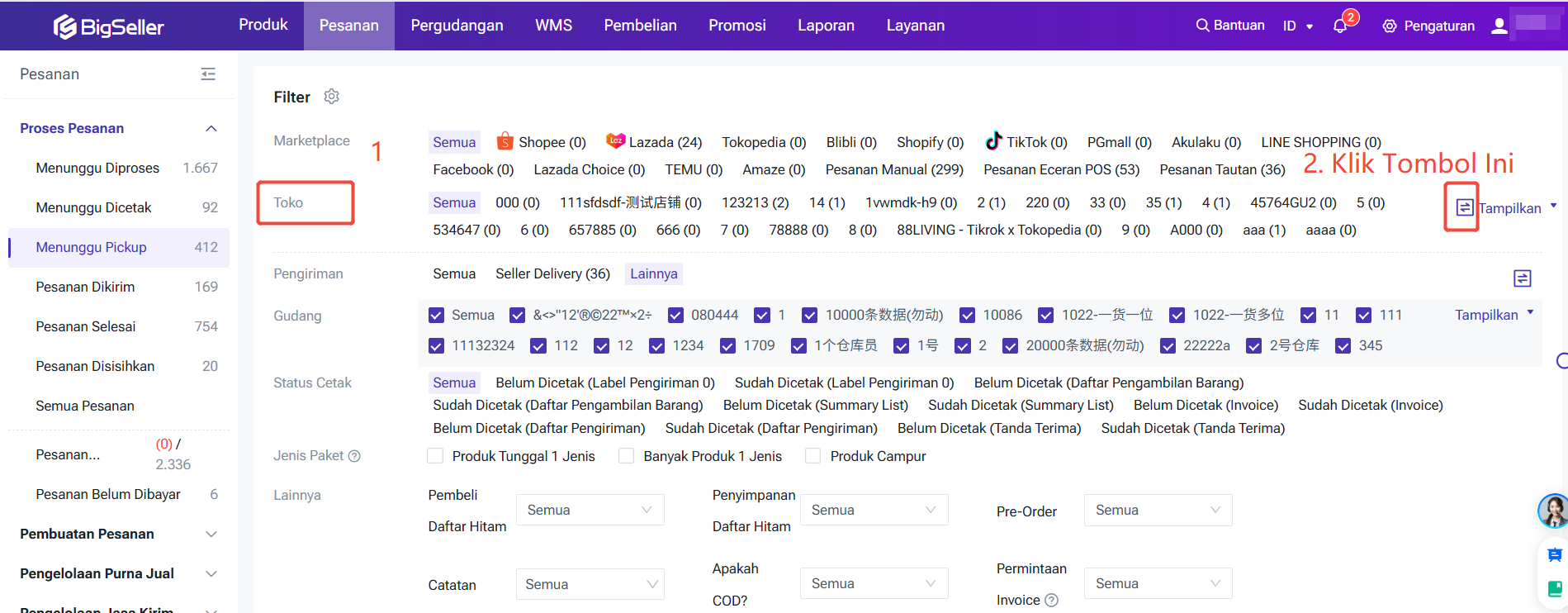 Anda dapat memfilter produk, pesanan atau data berdasarkan Grup Toko, agar memudahkan cepat memfilter produk & data, proses pesanan dan melakukan langkah - langkah yang diinginkan.