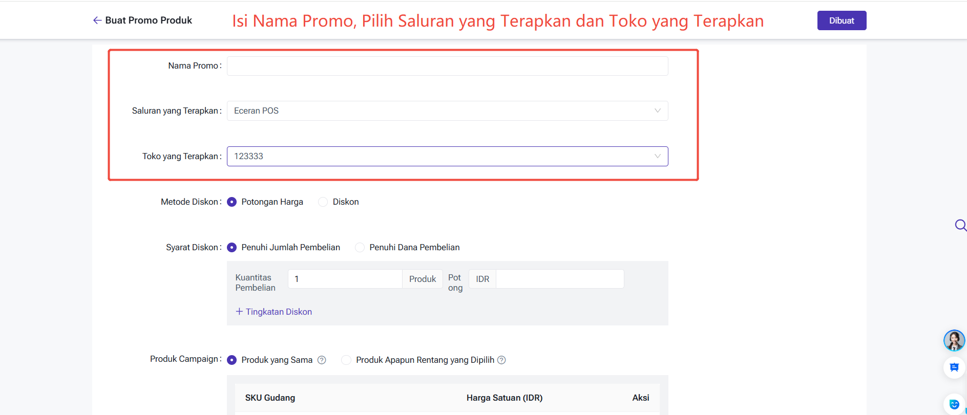 Langkah Kedua, Isi Nama Promo, Pilih Saluran yang Terapkan dan Pilih Toko yang Terapkan.