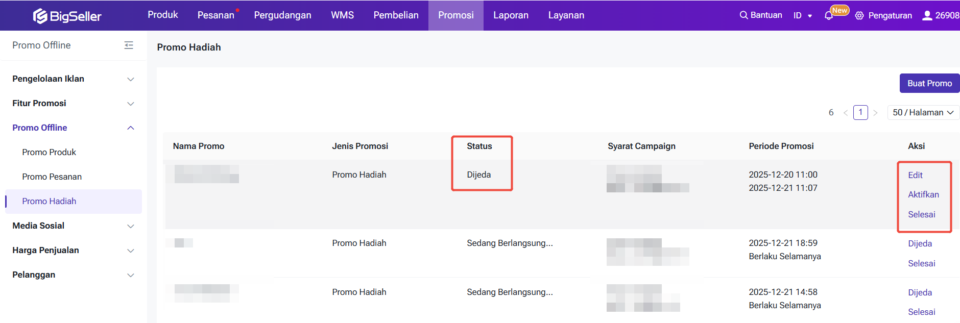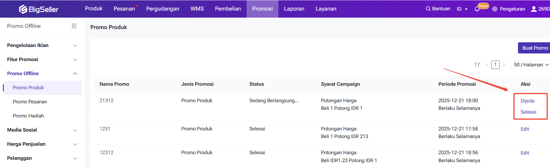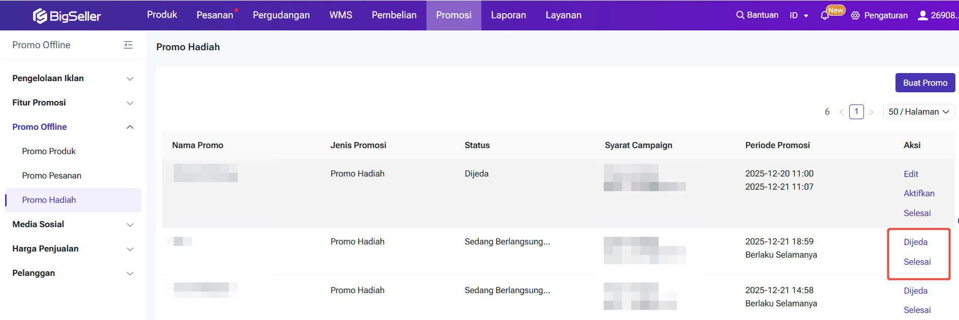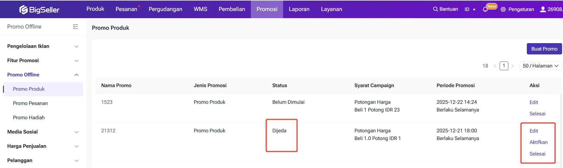 Untuk promo adalah status Sedang Berlangsung, Anda dapat Jeda Campaign atau Akhiri Promo secara manual.