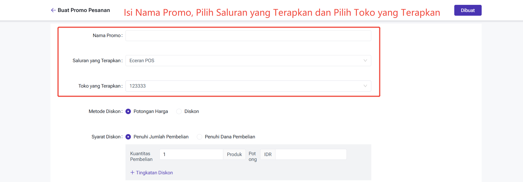 Langkah Kedua, Isi Nama Promo, Pilih Saluran yang Terapkan dan Pilih Toko yang Terapkan