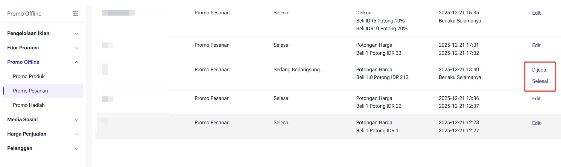 Untuk promo adalah status Dijeda, Anda dapat Edit/Aktifkan Campaign atau Akhiri Promo secara manual.