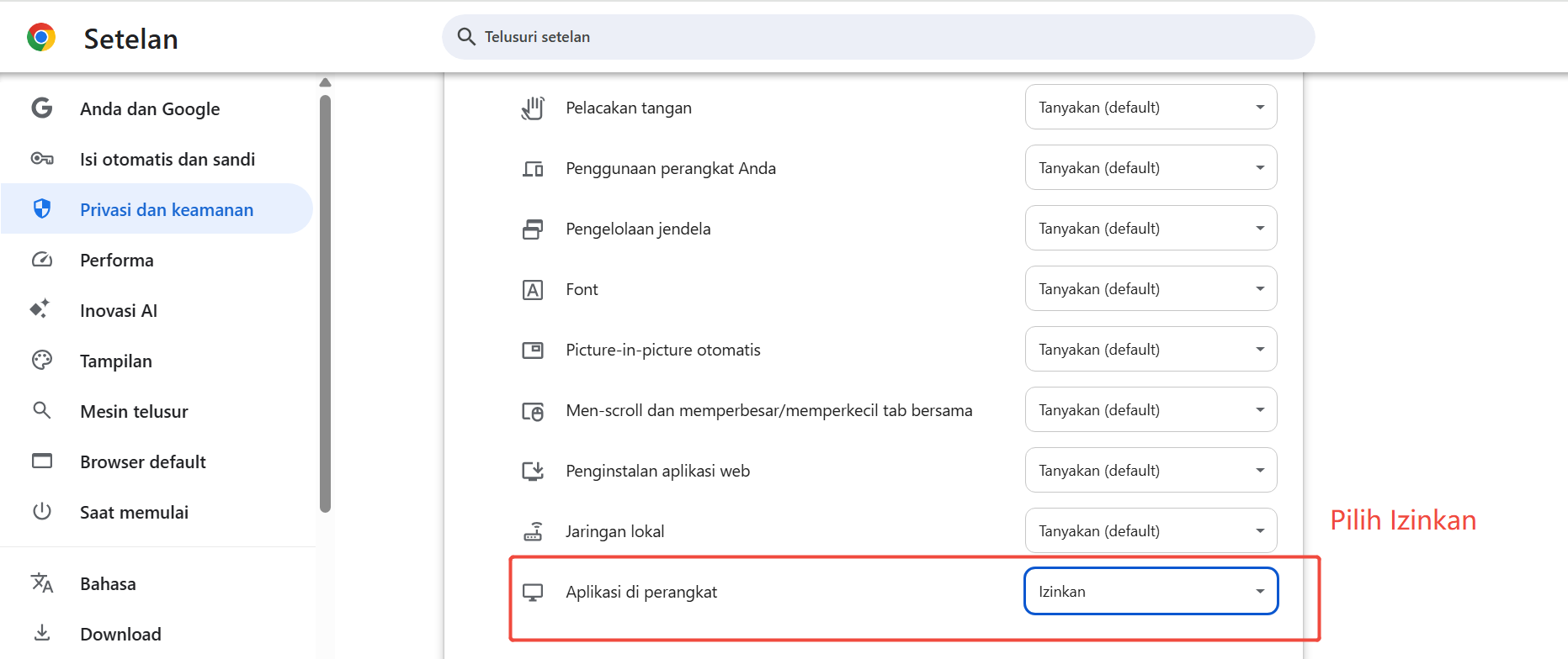 Buka browser, lalu klik link ini untuk salin link dan tempel di halaman browser, kemudian masuk ke halaman pengaturan browser dan ubah “Aplikasi di perangkat” menjadi Izinkan.