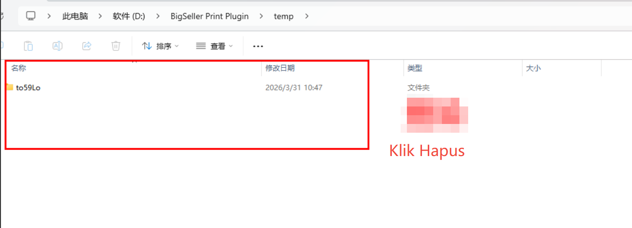 Buka direktori instalasi plugin, cari folder temp seperti D:\BigSeller Print Plugin\temp, lalu hapus semua file di dalam folder temp (sesuaikan dengan kondisi apakah perlu menghapus semuanya).