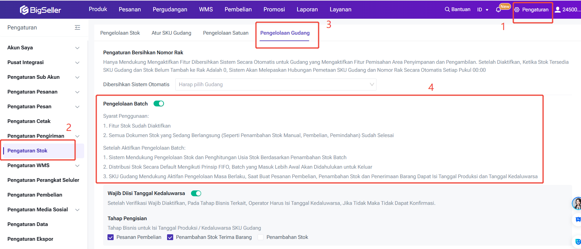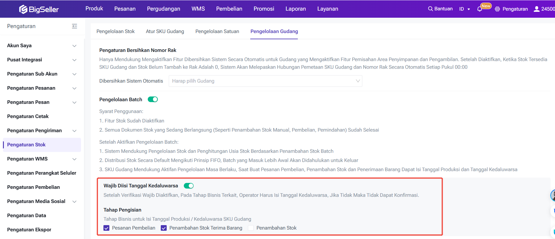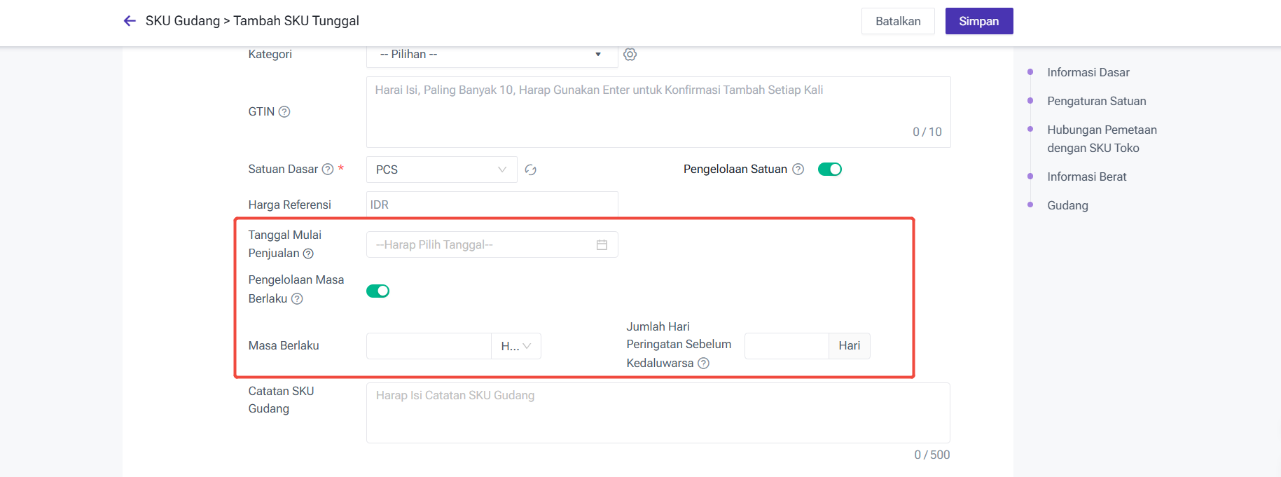 Jika pada aku BigSeller telah mengaktifkan “Wajib Diisi Tanggal Kedaluwarsa” dan mengatur agar kolom tersebut wajib diisi pada proses penerimaan barang, serta SKU produk telah mengaktifkan Pengelolaan Masa Berlaku, maka saat membuat SKU Gudang untuk pemeliharaan stok awal, kolom Tanggal Kedaluwarsa harus diisi.