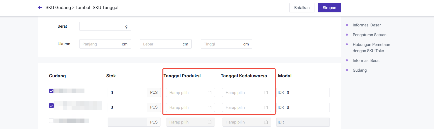 4.7.1 Untuk pembelian umum dan pembelian 1688 dengan gudang tujuan gudang sendiri, pada halaman Tambah & Edit ditambahkan kolom Tanggal Produksi, Masa Berlaku, Tanggal Kedaluwarsa di level SKU.