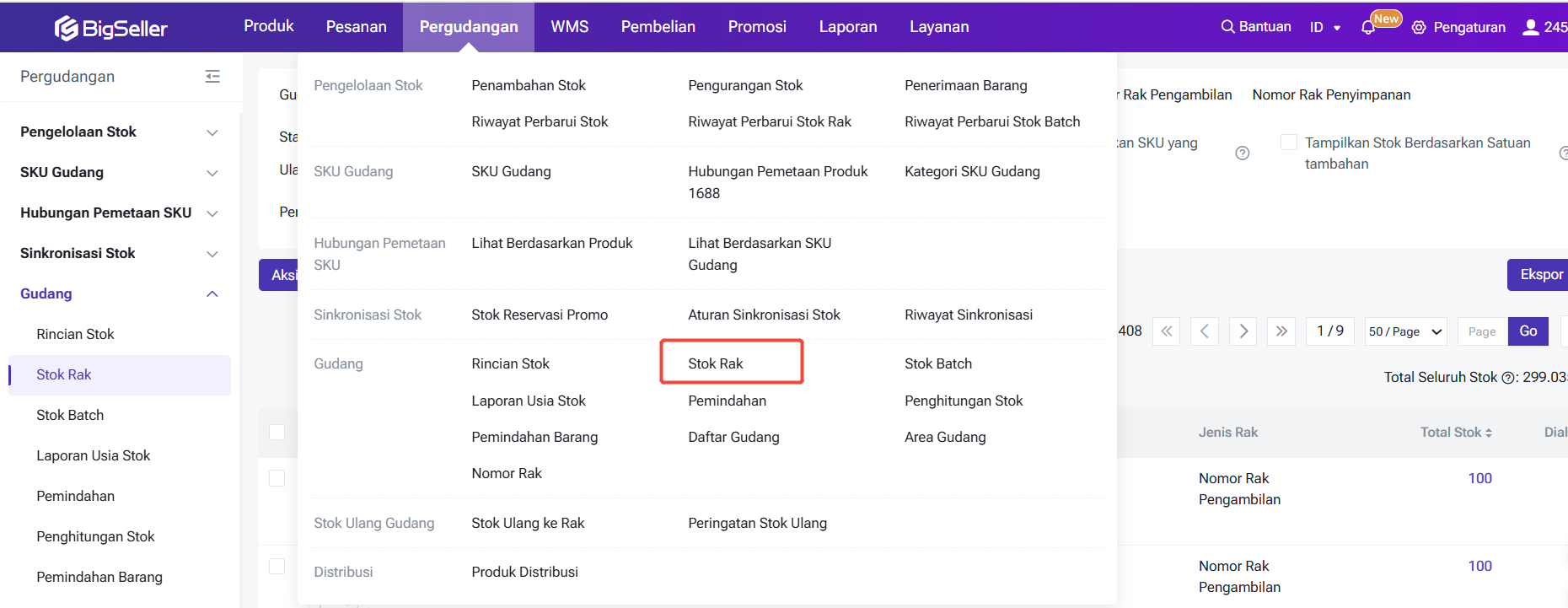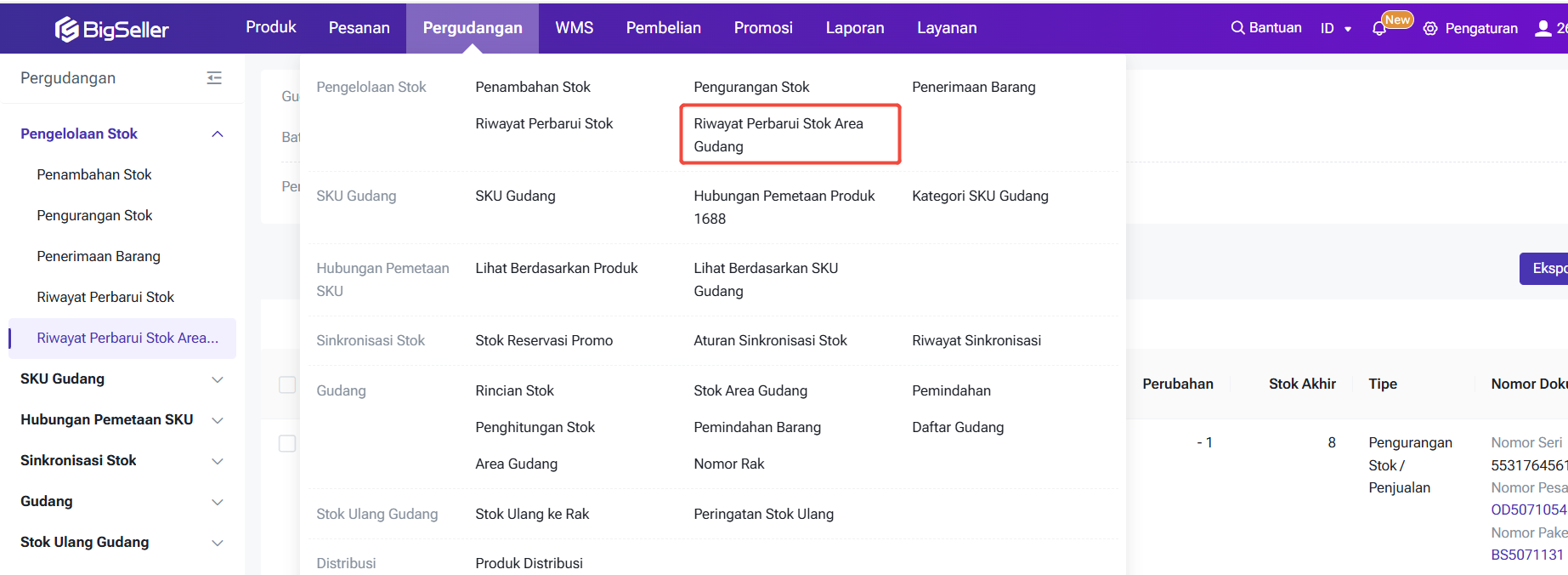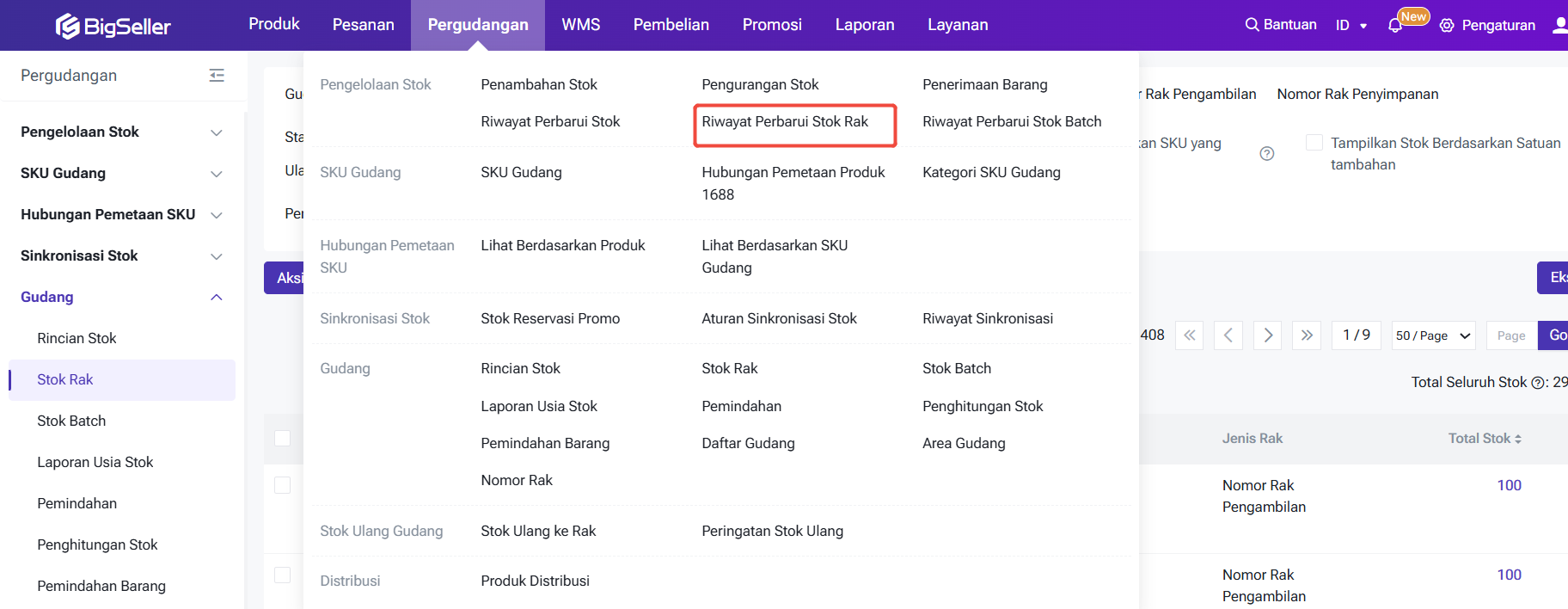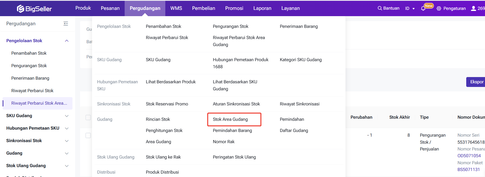 4.8.4 Jika pada akun BigSeller tidak mengaktifkan Fitur Pemisahan Area Penyimpanan dan Pengambilan, atau gudang belum melakukan tambah ke rak, maka menu “Stok Area Gudang” dan “Riwayat Perbarui Stok Rak” tidak akan ditampilkan.