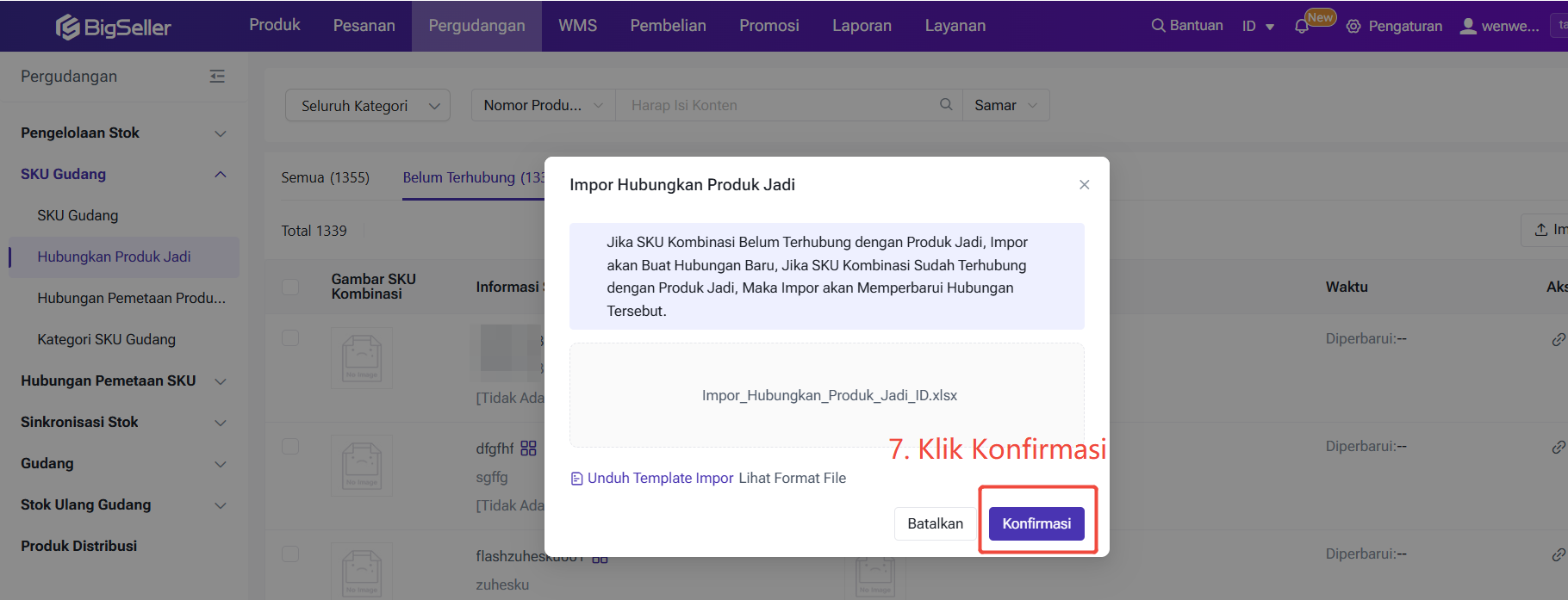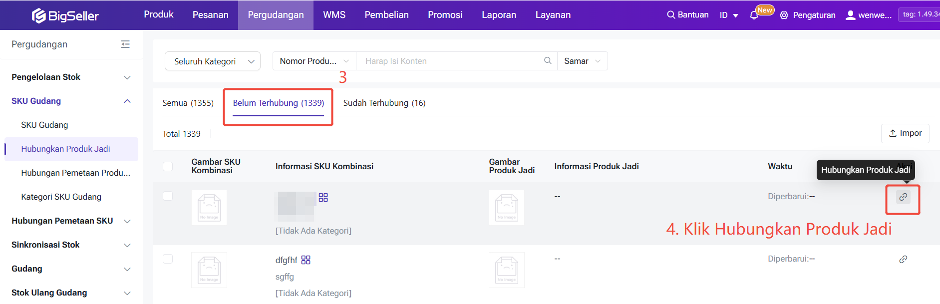 Masuk ke halaman Hubungkan Produk Jadi → Cari SKU Kombinasi di bagian “Semua” atau “Belum Terhubung” → Klik “Hubungkan” → Berhasil terhubung.
