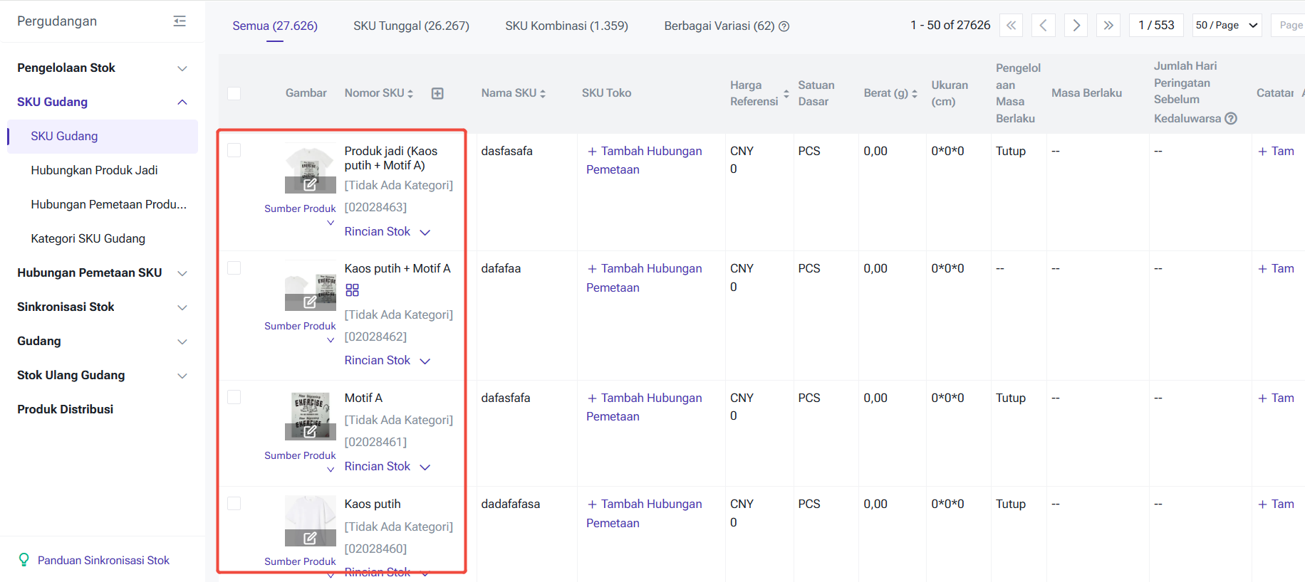 Sumber data berasal dari halaman SKU Gudang, dengan tipe SKU kombinasi, dan hanya mencakup data SKU Gudang yang memiliki izin akses pada akun saat ini.