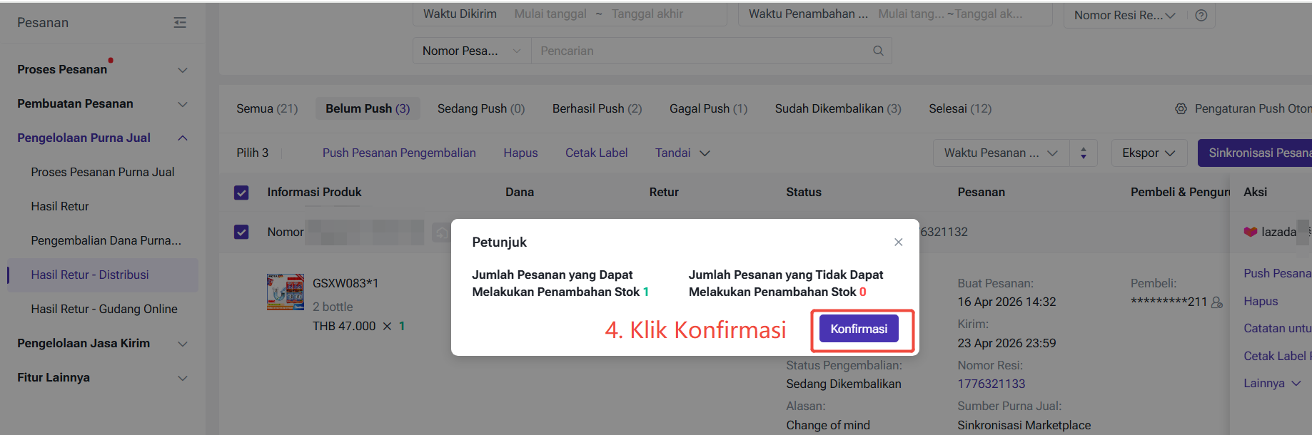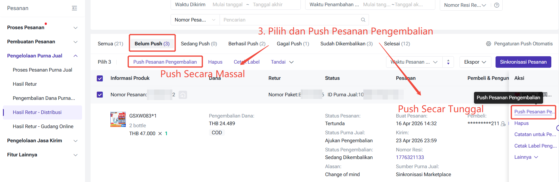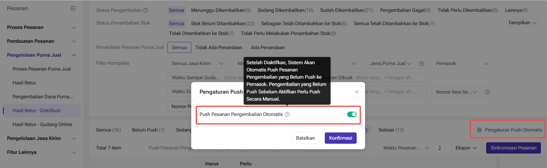 Pelacakan Status: Status pesanan inbound dibagi menjadi: Belum Didorong, Sedang Push, Berhasil Push, dan Gagal Push. Jika gagal, Anda harus melakukan "Push Pesanan Pengembalian" secara manual.