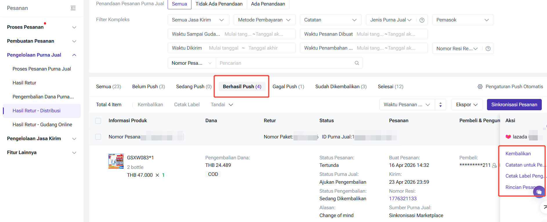 Setelah pesanan pengembalian berhasil push kepada pemasok Anda, pesanan nya akan otomatis masuk ke tab 【Berhasil Push】. Di tab ini, Anda dapat melakukan empat aksi di bawah: