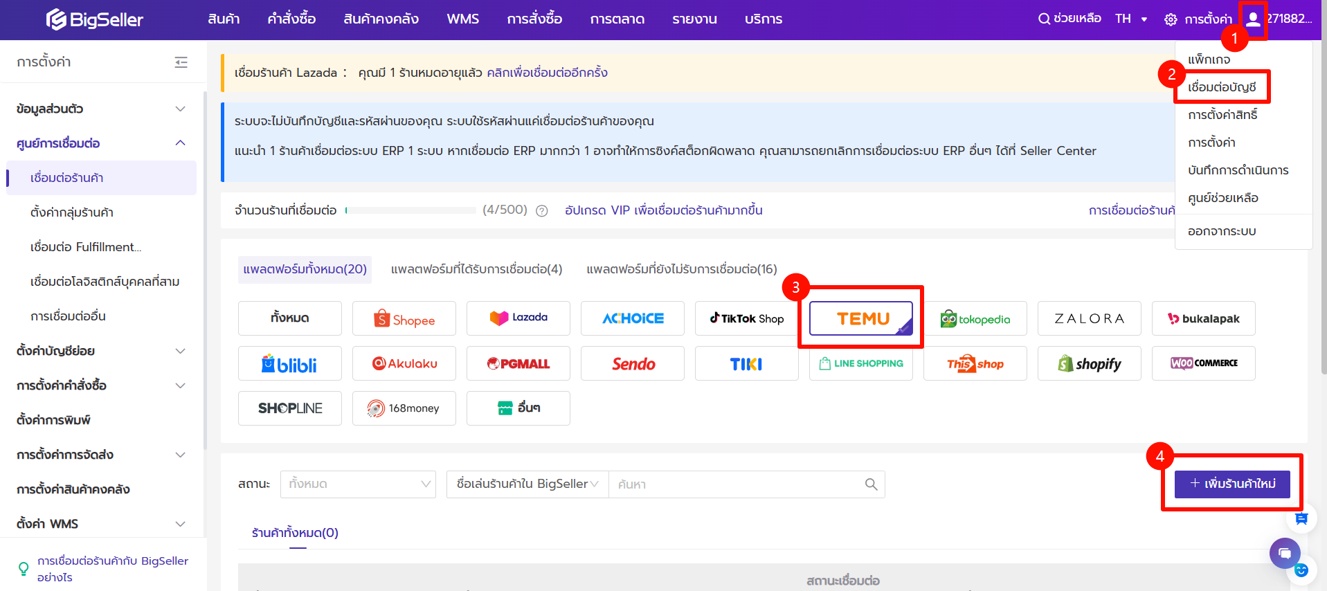ขั้นตอนที่ 1 ไปที่ การตั้งค่า > ศูนย์การเชื่อมต่อ > เชื่อมต่อร้านค้า > เลือกแพลตฟอร์ม TEMU > +เพิ่มร้านค้าใหม่
