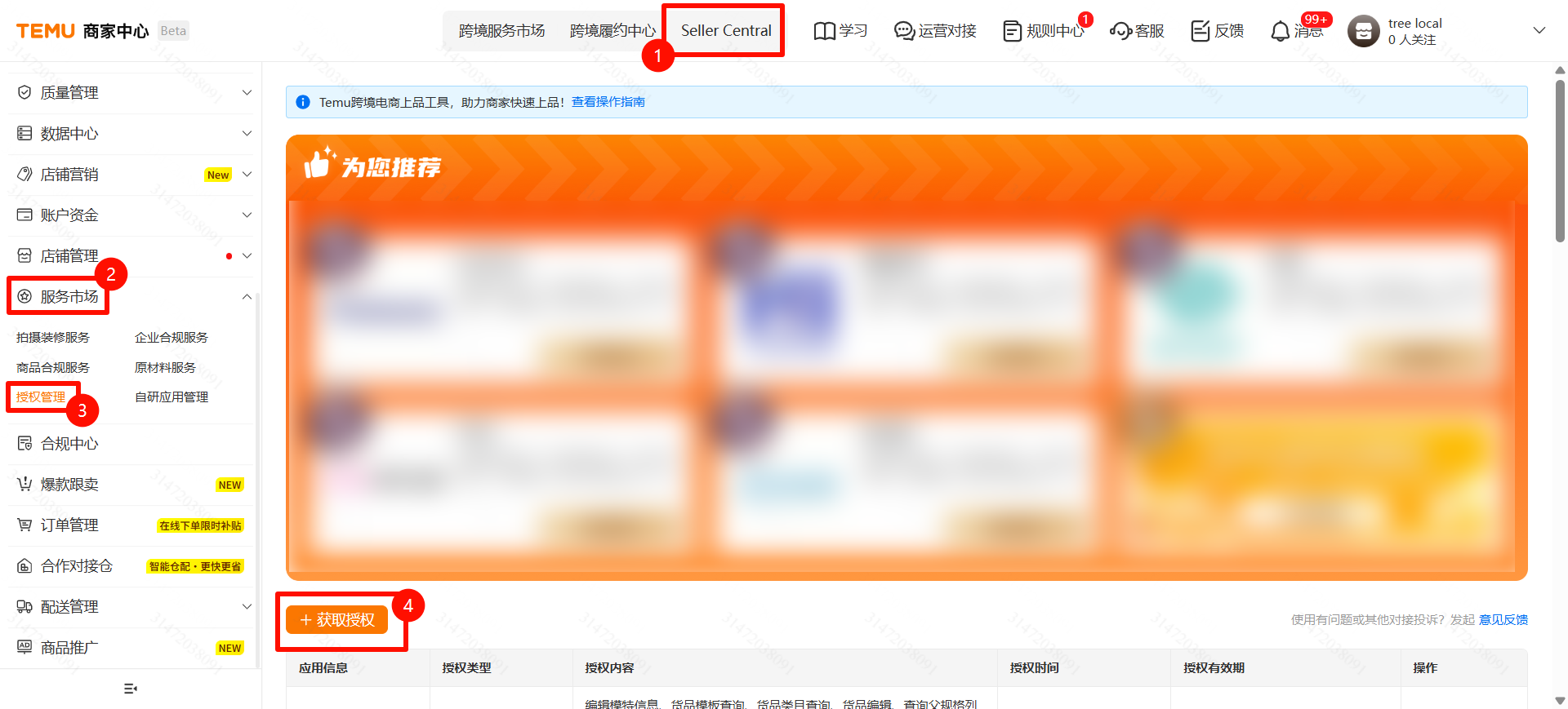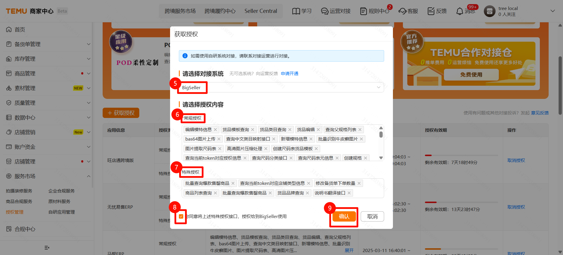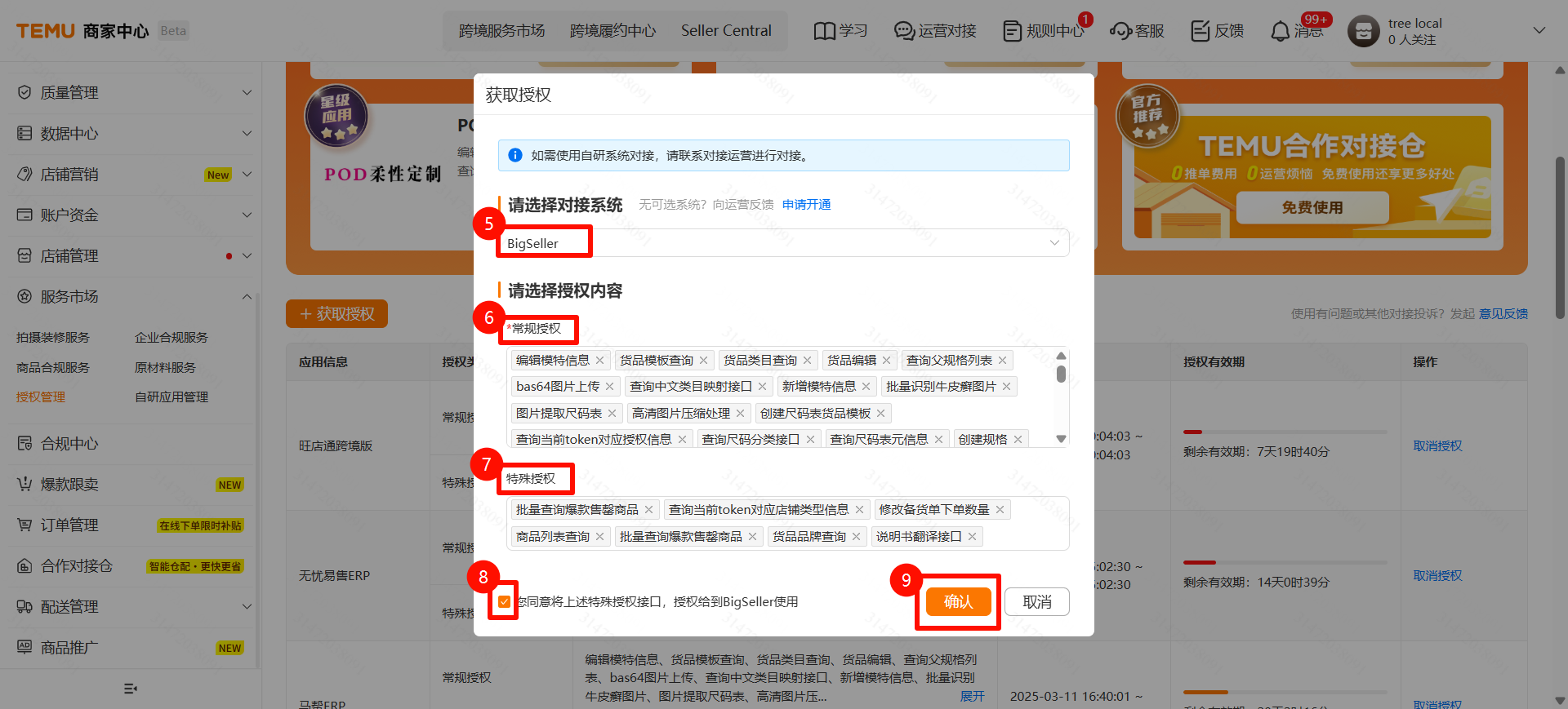 - ไปที่เมนู 服务市场 > 授权管理 > 获取授权 > 选择 BigSeller > 选择全部(常规授权和特殊授权)> 确认