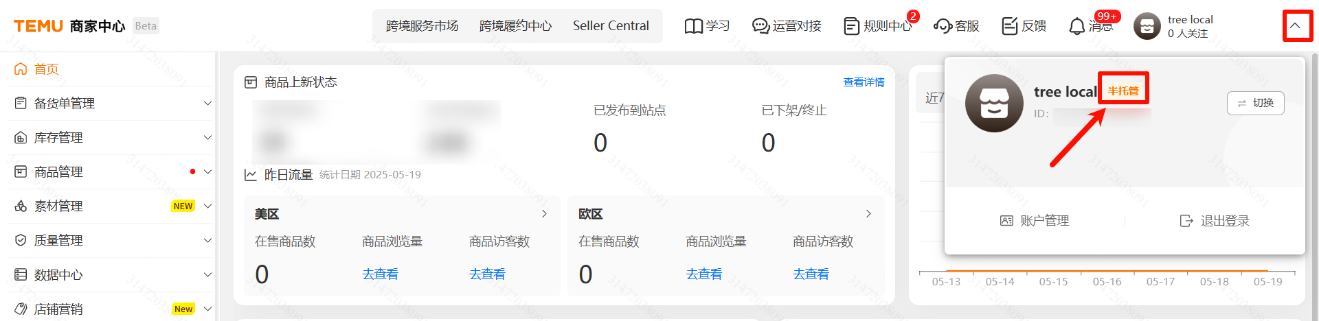 หากเป็นร้านค้าแบบ Semi-managed จะมีไอคอนสีส้มแสดงคำว่า "半托管" ถัดจากชื่อร้านค้า