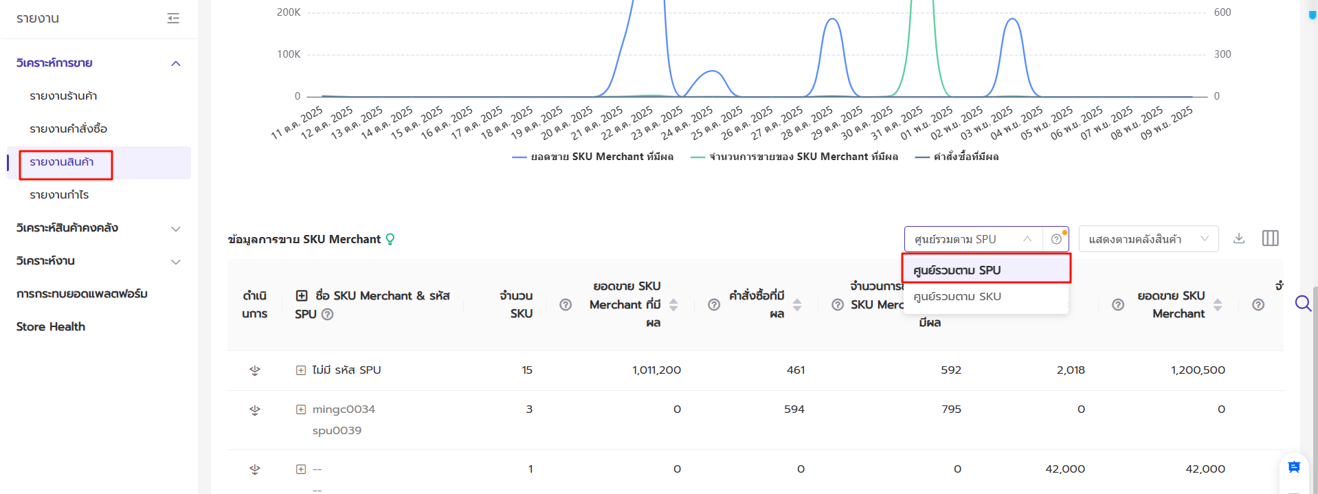 ฟังก์ชันรายงานสินค้า จะสรุปยอดขายตาม SKU สินค้าในร้านค้าและ SKU Merchant