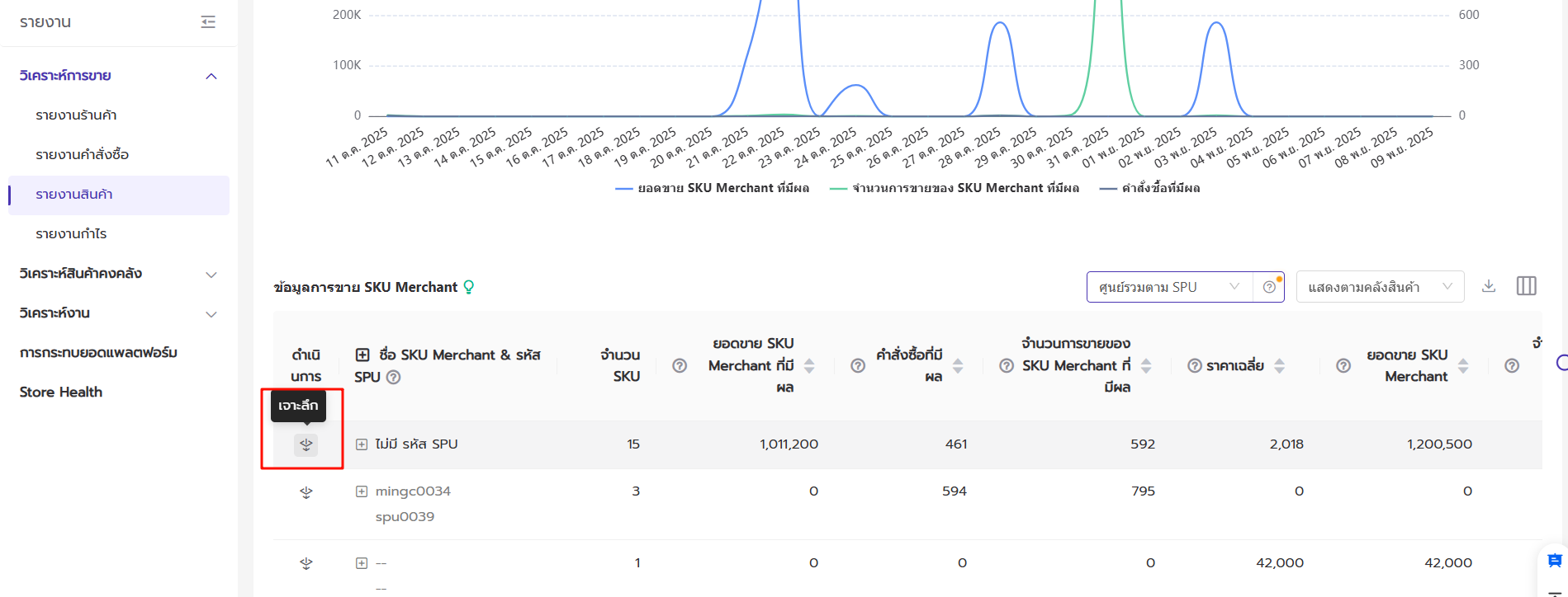 สามารถกด "เจาะลึก" เพื่อดูรายละเอียด SKU ภายใต้ SPU นั้น