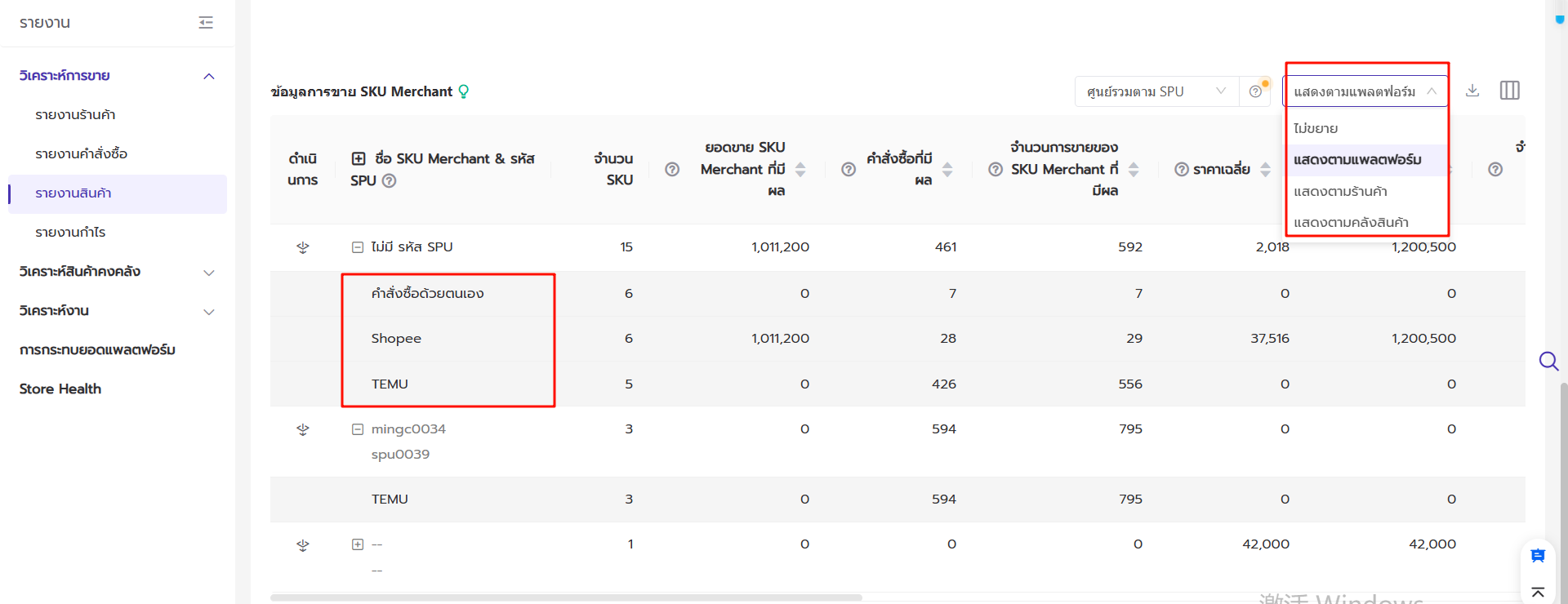ในเมนู "สรุปตาม SKU Merchant" ผู้ใช้งานยังสามารถแสดงข้อมูลตามแพลตฟอร์ม/ร้านค้า/คลังสินค้า