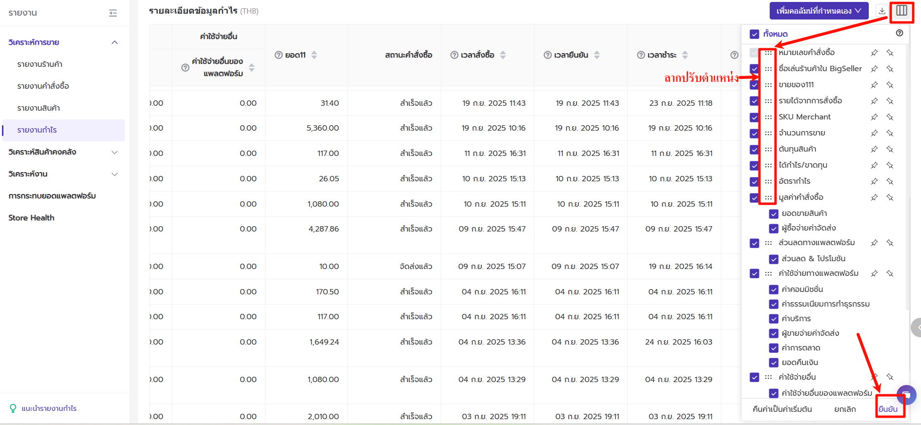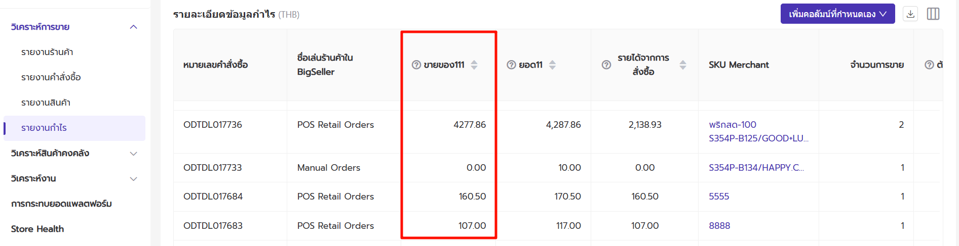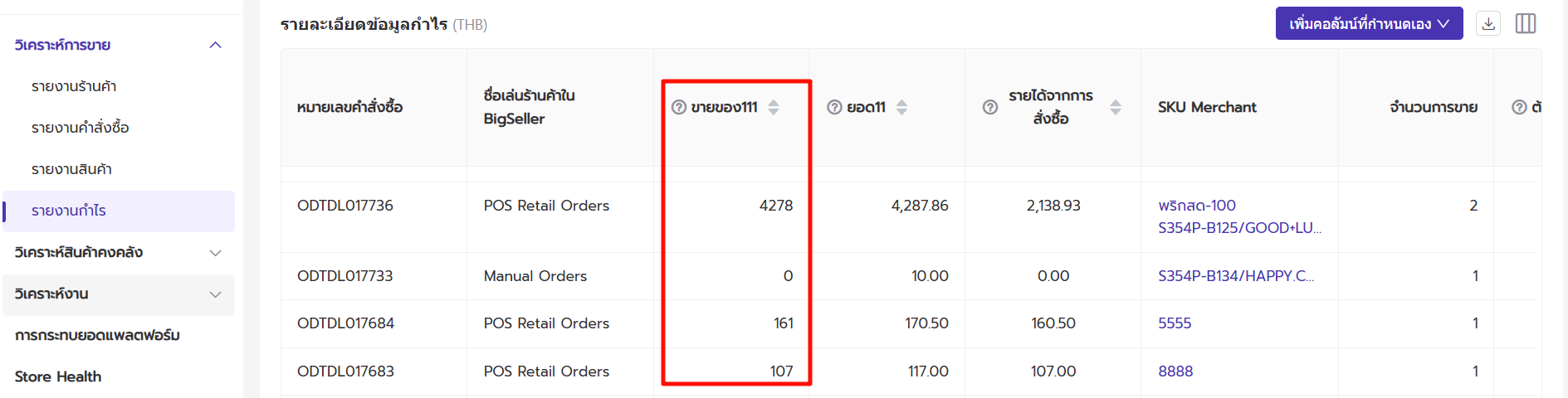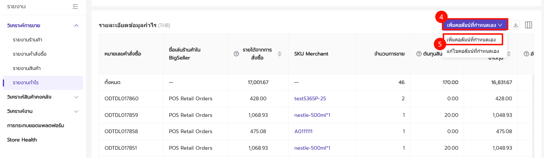 1. เข้าสู่เมนู "รายงาน" > คลิก "รายงานกำไร" > เลือกแท็บที่ต้องการ- การเพิ่มคอลัมน์ที่กำหนดเอง สามารถเพิ่มได้จากหน้าดังต่อไปนี้