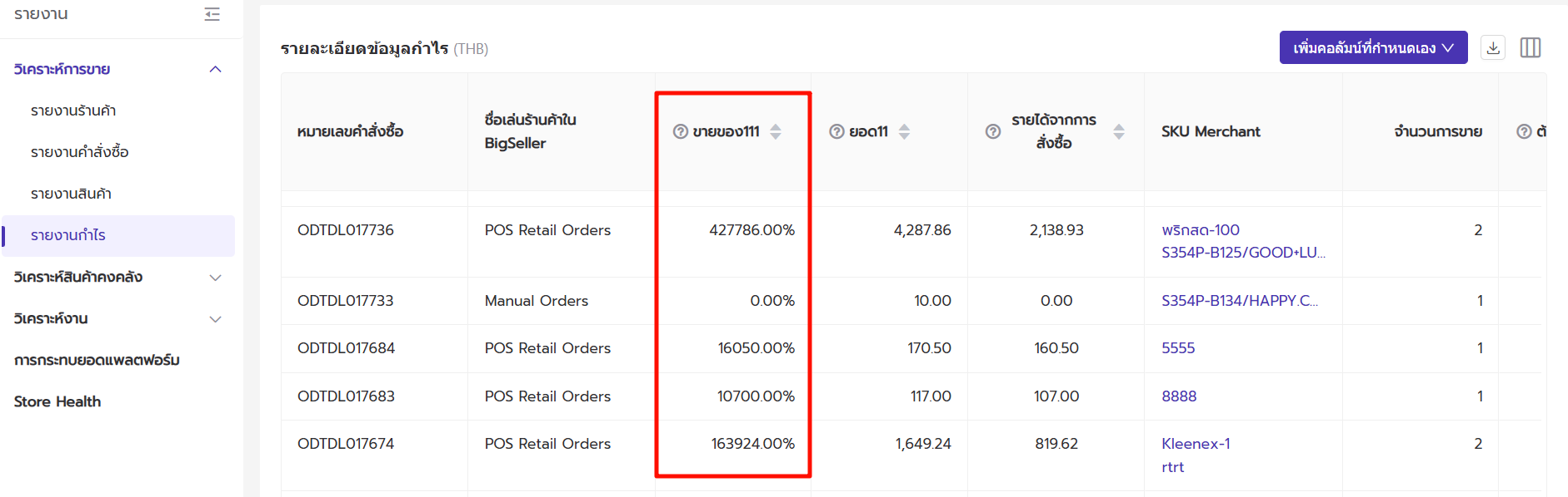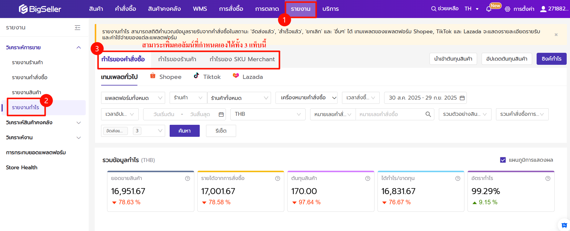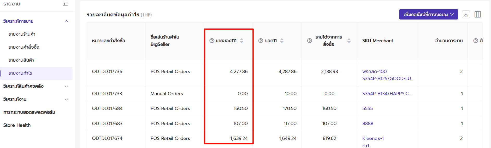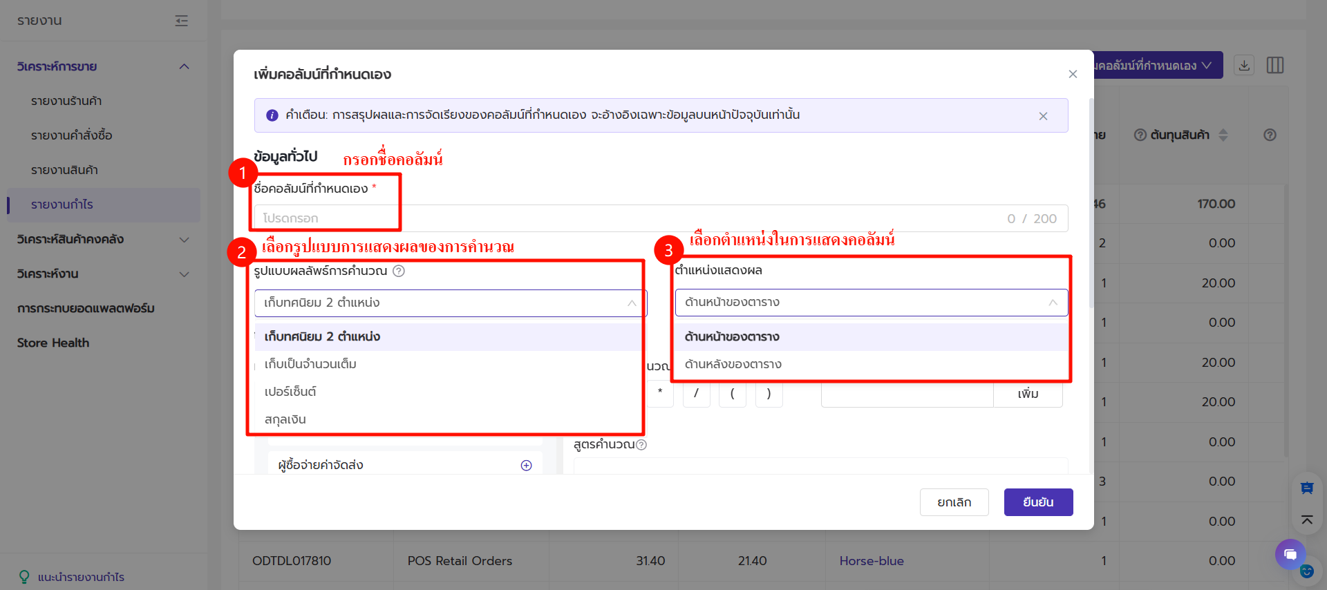 1. เข้าสู่เมนู "รายงาน" > คลิก "รายงานกำไร" > เลือกแท็บที่ต้องการ- การเพิ่มคอลัมน์ที่กำหนดเอง สามารถเพิ่มได้จากหน้าดังต่อไปนี้
