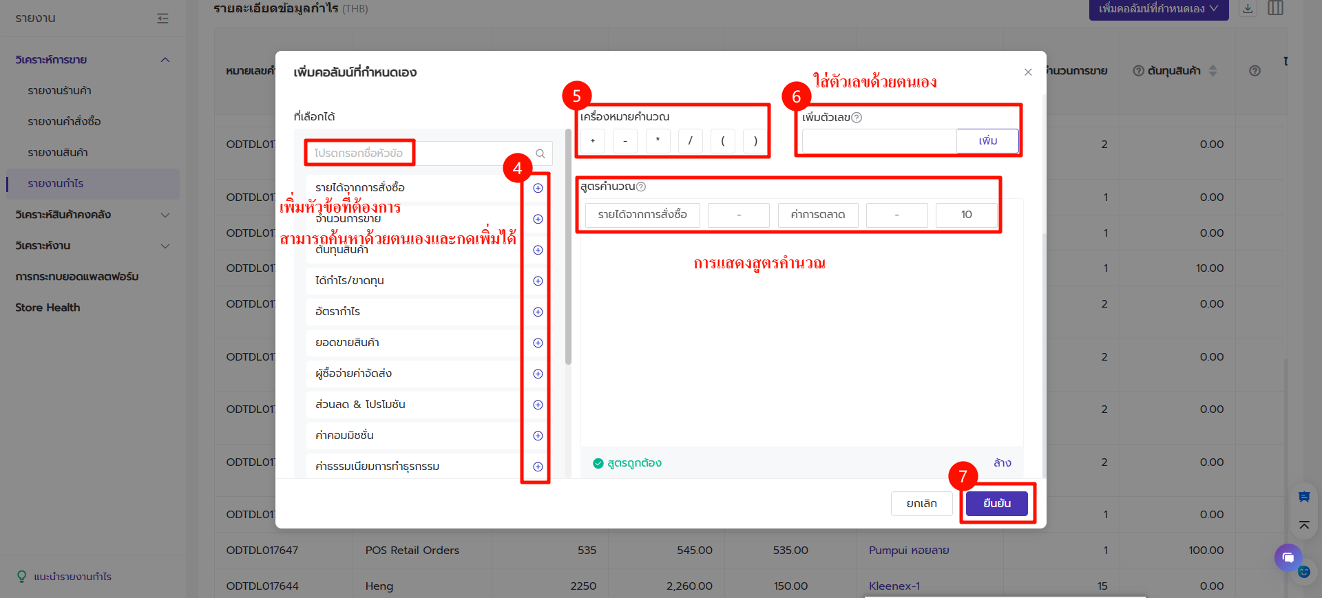 ด้วยฟังก์ชัน การเพิ่มคอลัมน์ที่กำหนดเอง คุณสามารถสร้างหัวข้อใหม่เพื่อคำนวณกำไร หรือยอดอื่นๆ ที่อยู่นอกเหนือจากค่ามาตรฐานของระบบได้อย่างยึดหยุ่น เช่น ตัวชี้วัดจากโปรโมชัน แคมเปญ หรือค่าใช้จ่ายจากการลงโฆษณาสินค้าใหม่ เป็นต้นเพียงเลือกหัวข้อที่มีอยู่ นำมาสร้างสูตรคำนวณร่วมกับสัญลักษณ์คำนวณ ก็สามารถวิเคราะห์รายงานได้อย่างสะดวก รวกเร็ว และตอบโจทย์การใช้งานเฉพาะของคุณ