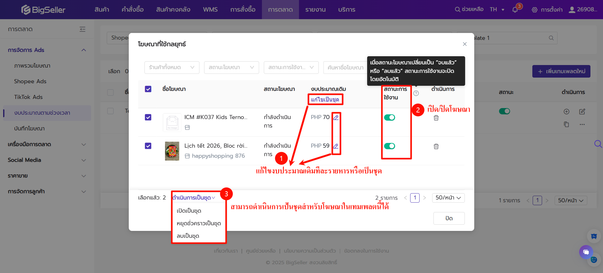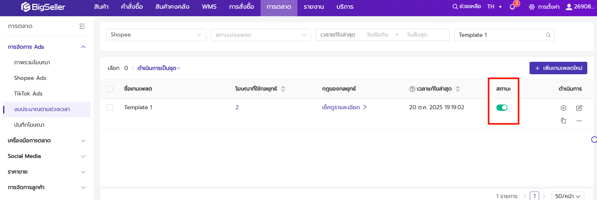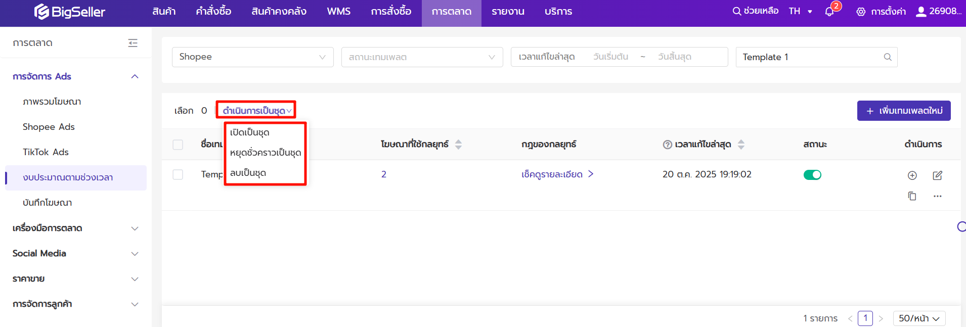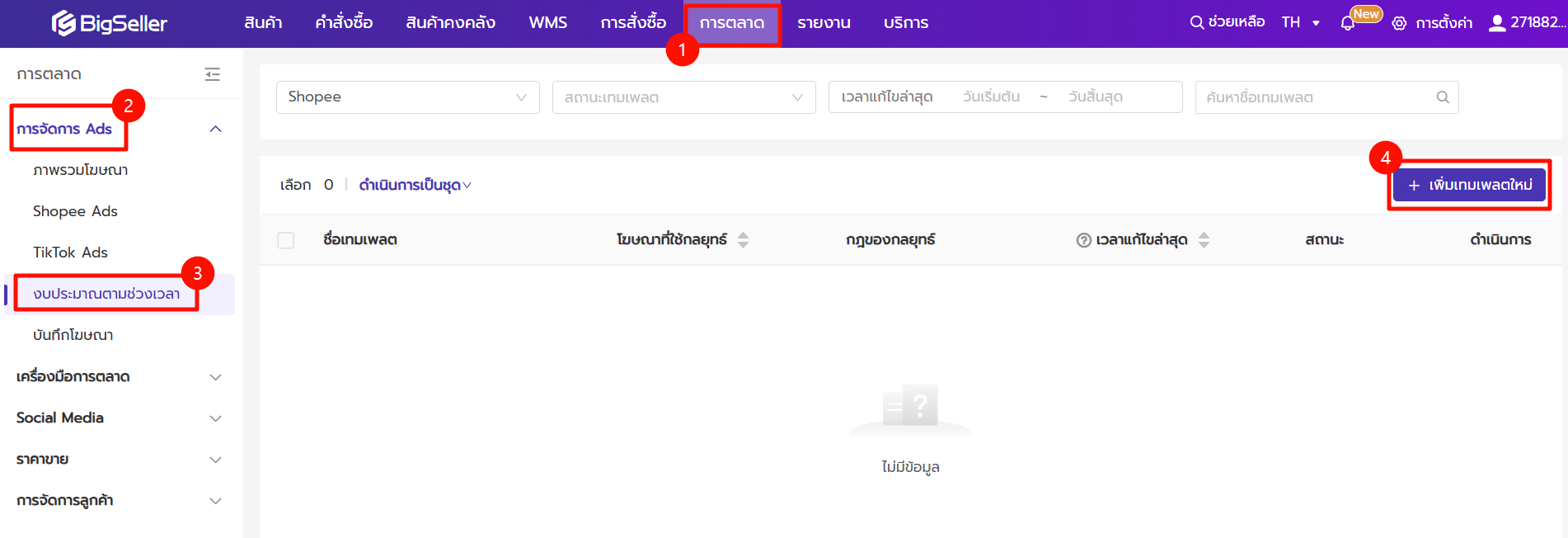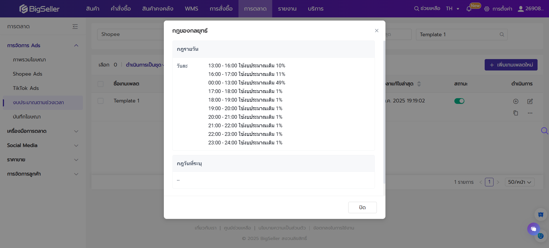 ฟังก์ชัน "งบประมาณตามช่วงเวลา" ช่วยให้ผู้ขายสามารถตั้งค่ากลยุทธ์งบประมาณล่วงหน้าตามช่วงเวลาได้ ระบบจะปรับงบประมาณโฆษณาโดยอัตโนมัติตามเวลาที่ตั้งไว้ล่วงหน้า โดยไม่ต้องดำเนินการด้วยตนเอง ช่วยให้การจัดการงบโฆษณามีความอัจฉริยะและมีประสิทธิภาพมากขึ้น ช่วยเพิ่มประสิทธิภาพในการโฆษณา ลดการใช้งบประมาณโดยไม่จำเป็น และประหยัดเวลาและลดต้นทุนแรงงานขั้นตอนการตั้งค่าเทมเพลตงบประมาณ