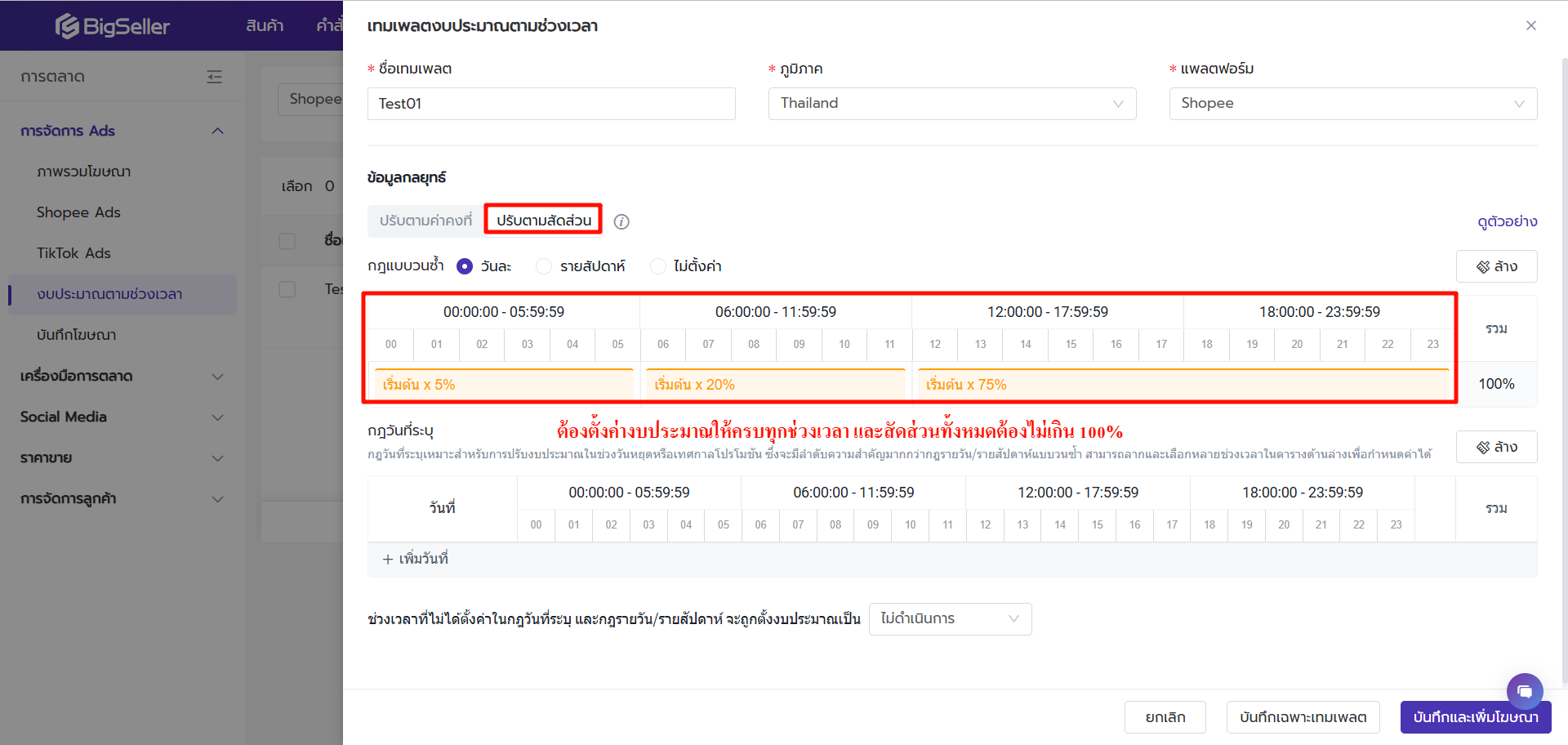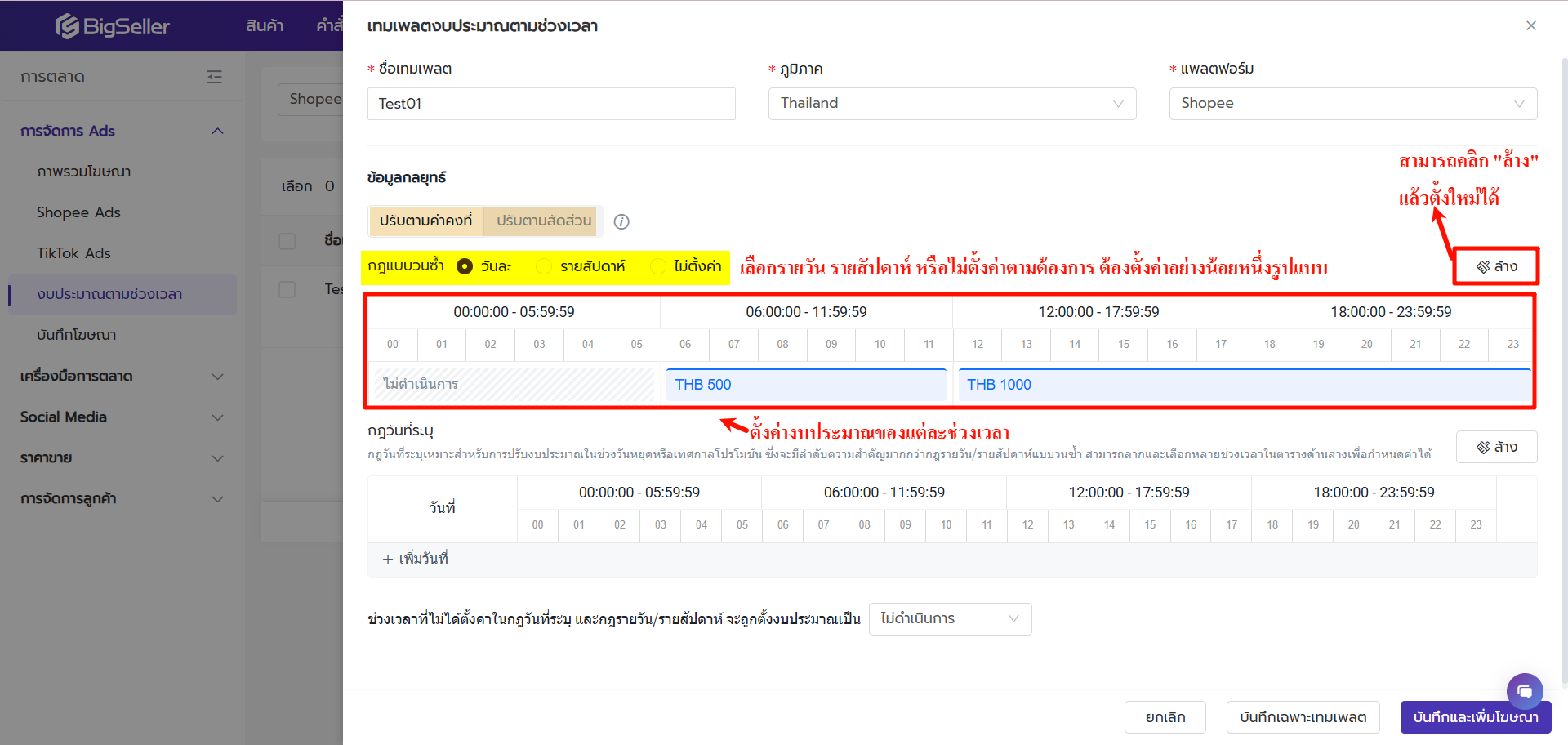 1. รายวัน: สามารถเลือกได้หลายช่วงเวลาของรายวัน ระบบจะปรับงบตามกฎที่ตั้งไว้ในช่วงเวลานั้น ๆ ของทุกวัน