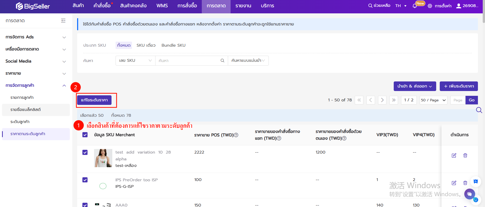 ผู้ใช้งานสามารถแก้ไขทีละรายการหรือแก้ไขราคาตามระดับลูกค้าให้กับสินค้าที่เลือกไว้ทั้งหมดพร้อมกันได้