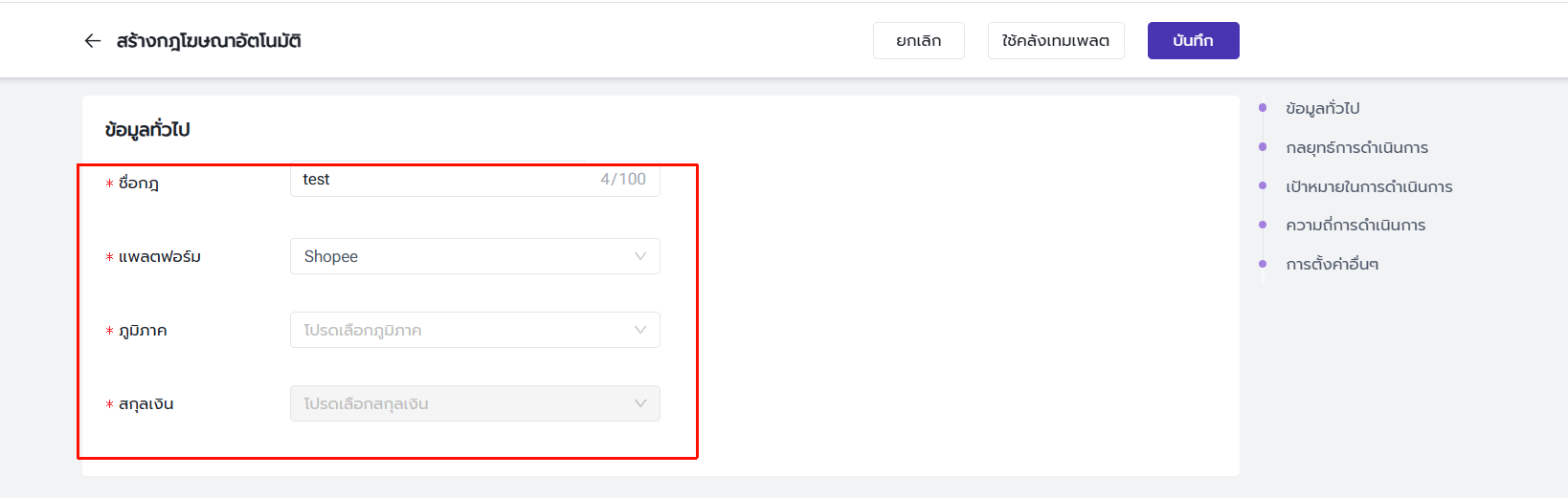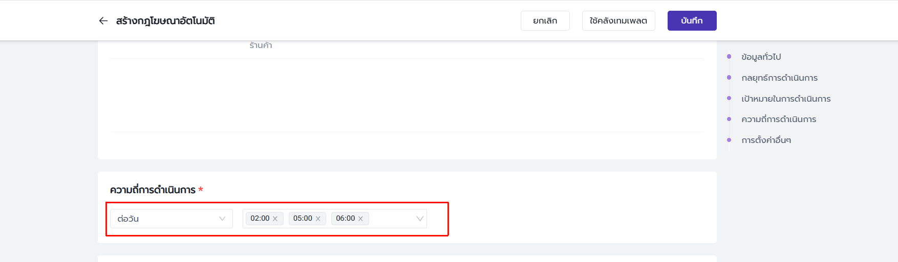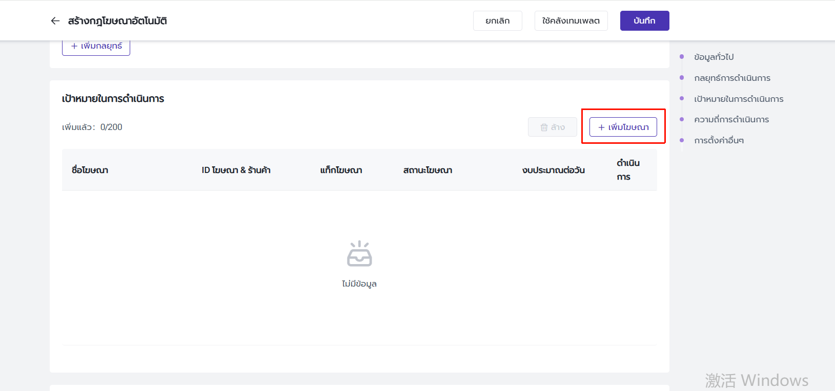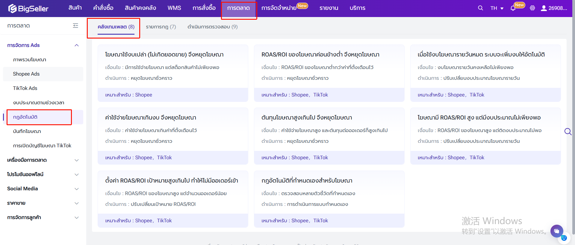 ไปที่เมนู การตลาด > การจัดการ Ads > กฎอัตโนมัติ > คลังเทมเพลต > เลือกเทมเพลต