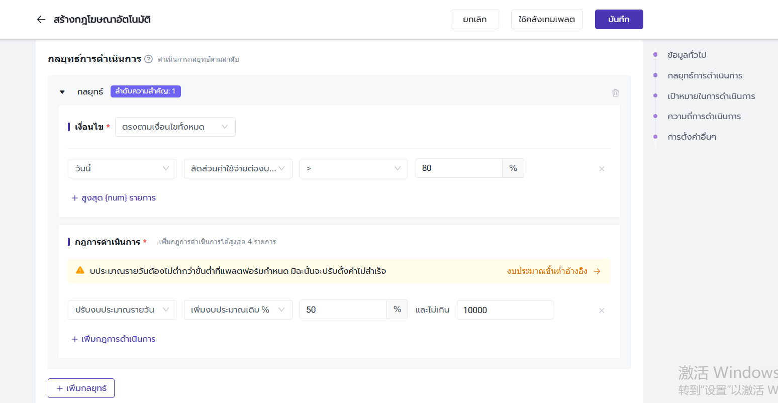 ยกตัวอย่างเช่น: หากตั้งค่าตามรูปด้านล่างนี้ เมื่อ “สัดส่วนค่าใช้จ่ายต่องบประมาณ” มากกว่า 80% ของงบประมาณรายวัน ระบบจะปรับงบประมาณของวันนี้เพิ่มขึ้น 50% จากงบประมาณรายวันเดิม และไม่เกินค่าสูงสุดที่ตั้งไว้