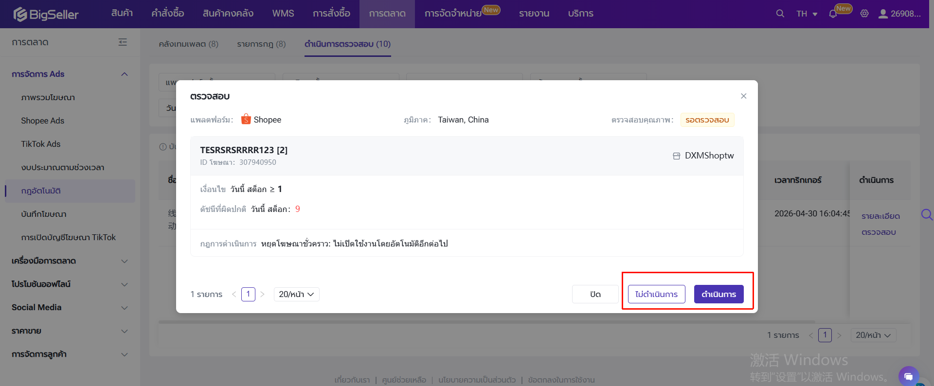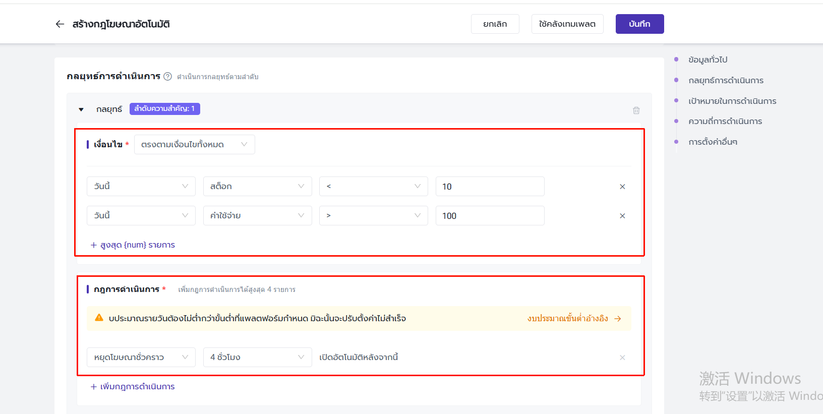 หากตั้งค่าตามรูปด้านบน หมายความว่า เมื่อสต็อกของวันนี้ต่ำกว่า 10 และมีค่าใช้จ่ายโฆษณามากว่า 100 ระบบจะหยุดโฆษณาชั่วคราวเป็นเวลา 4 ชั่วโมง
