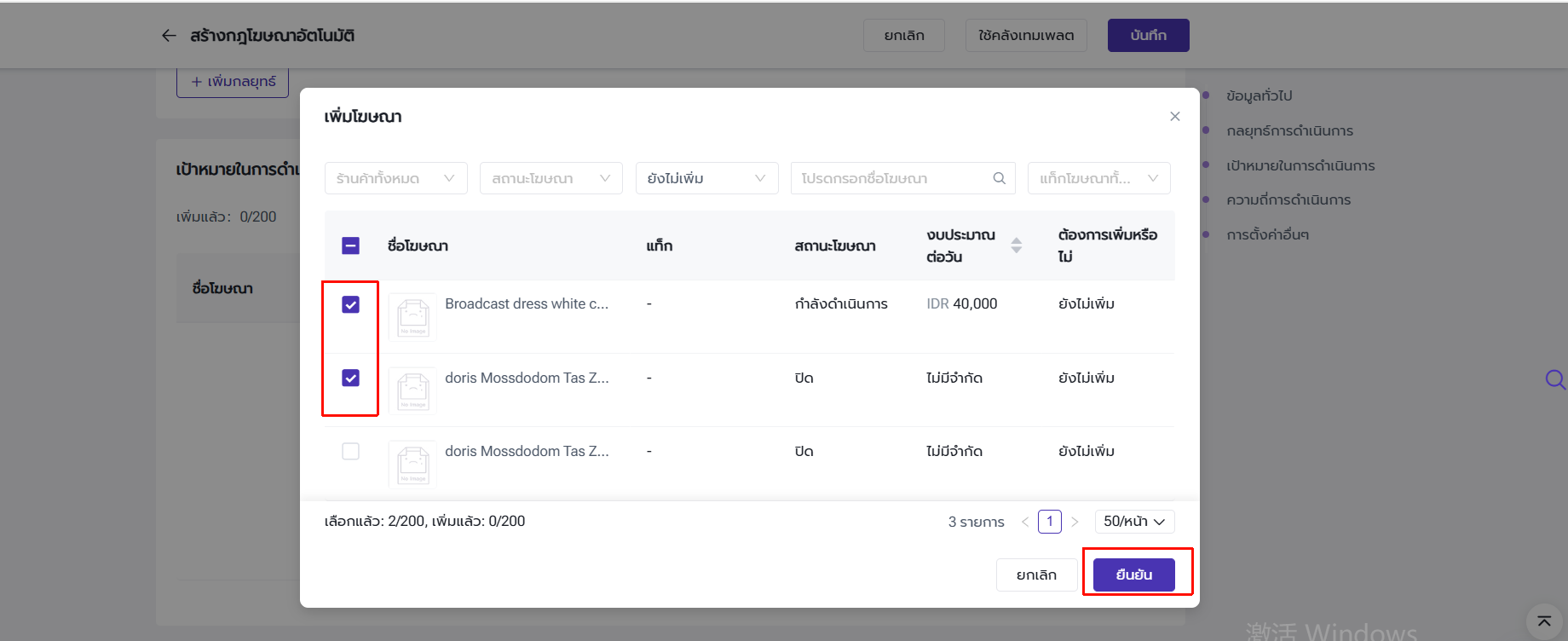 กด "เพิ่มโฆษณา" > เลือกโฆษณา > กด "ยืนยัน"