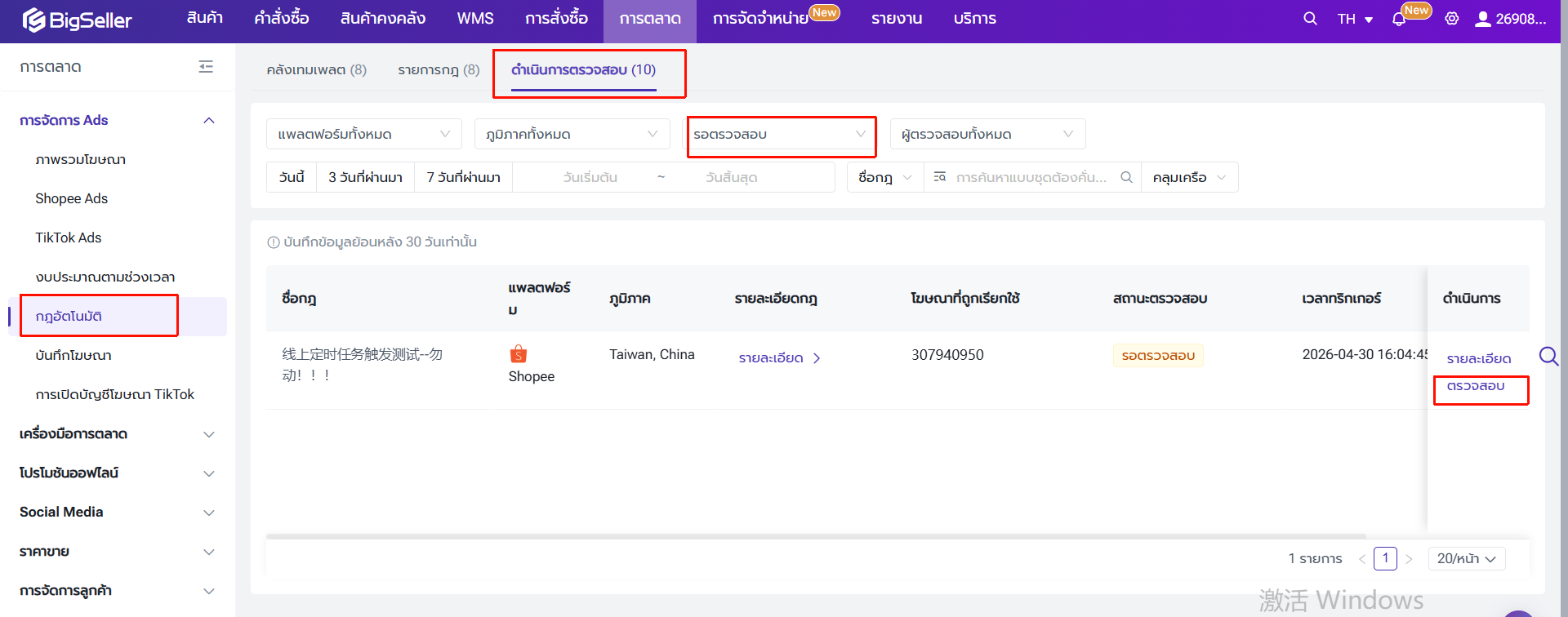 เมื่อเลือกให้ดำเนินการปรับงบหลังจากผ่านการตรวจสอบโดยเจ้าหน้าที่ หากโฆษณาตรงตามเงื่อนไขของกฎ ระบบจะแสดงรายการตรวจสอบในเมนู "ดำเนินการตรวจสอบ > รอตรวจสอบ" ผู้ตรวจสอบสามารถกด "ตรวจสอบ" เพื่อเลือกว่าจะดำเนินการปรับงบโฆษณาหรือไม่