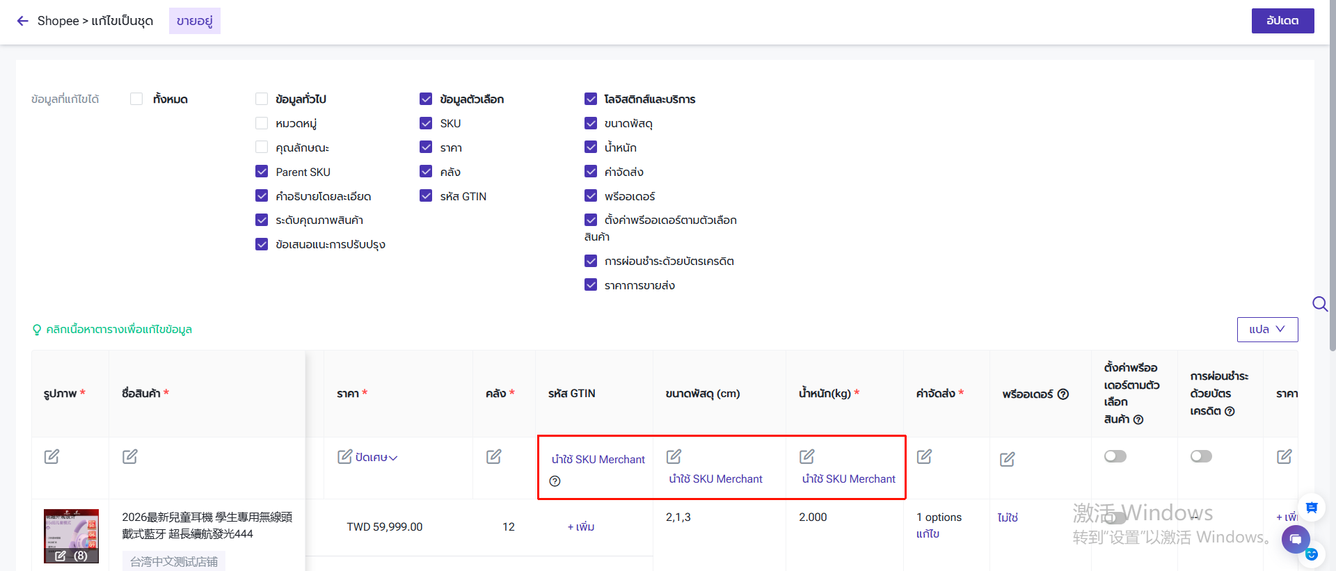 สำหรับผู้ใช้งานที่ได้สร้างและจับคู่ SKU Merchant แล้ว เมื่อแก้ไขข้อมูลของสินค้าจาก Shopee สามารถใช้ฟีเจอร์ "นำใช้ SKU Merchant" เพื่ออ้างอิงข้อมูล "รหัส GTIN" "ขนาดพัสดุ" และ "น้ำหนัก" จาก SKU Merchant ได้โดยตรง เพื่อประหยัดเวลาในการแก้ไขข้อมูลของสินค้า