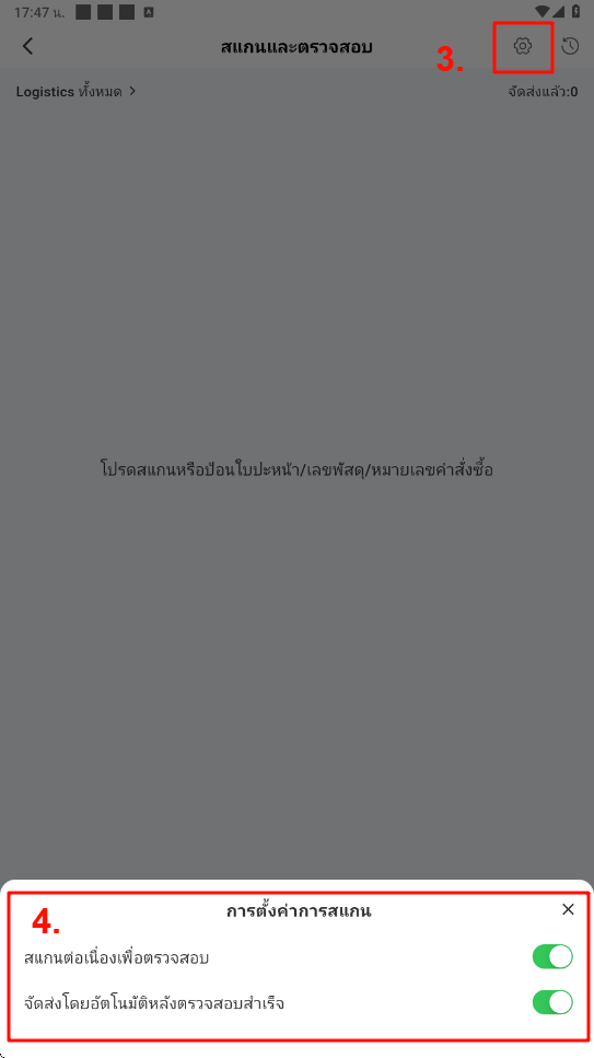 หากเปิดปุ่ม "สแกนต่อเนื่องเพื่อตรวจสอบ" ผู้ใช้งานจะสามารถดำเนินการสแกนสินค้าอย่างต่อเนื่อง โดยไม่จำเป็นต้องกดปุ่ม "สแกน" ซ้ำหลังจากสแกนสินค้าชิ้นหนึ่งเสร็จ