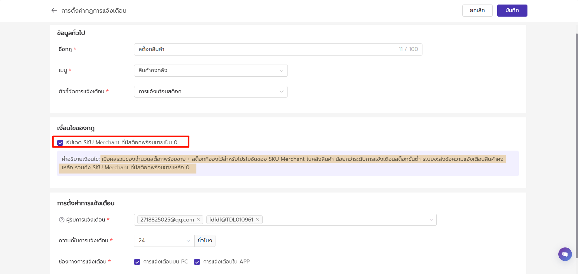 1) เมื่อตั้งค่าตัวชี้วัดสินค้าคงคลังเป็น "การแจ้งเตือนสต็อก" คุณสามารถเลือกได้ว่าจะอัปเดต SKU Merchant ที่มีสต็อกพร้อมขายเป็น 0 หรือไม่หากเลือกไว้ เมื่อผลรวมของจำนวนสต็อกพร้อมขาย + สต็อกที่จองไว้สำหรับโปรโมชันของ SKU Merchant ในคลังสินค้า น้อยกว่าระดับการแจ้งเตือนสต็อกขั้นต่ำ ระบบจะส่งข้อความแจ้งเตือนสินค้าคงเหลือ รวมถึง SKU Merchant ที่มีสต็อกพร้อมขายเหลือ 0
