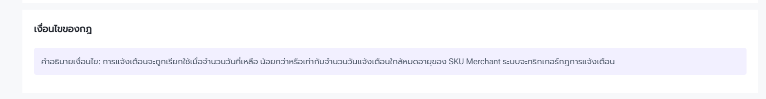 2)หากผู้ใช้งานเปิดใช้งานฟีเจอร์ “การจัดการล็อตสินค้า” สามารถตั้งค่าการแจ้งเตือนใกล้หมดอายุได้ เมื่อจำนวนวันที่เหลือก่อนวันหมดอายุ น้อยกว่าหรือเท่ากับ “จำนวนวันแจ้งเตือนใกล้หมดอายุ” ที่ตั้งค่าไว้ในข้อมูล SKU Merchant ระบบจะส่งข้อความแจ้งเตือนให้ผู้ใช้งานทราบ