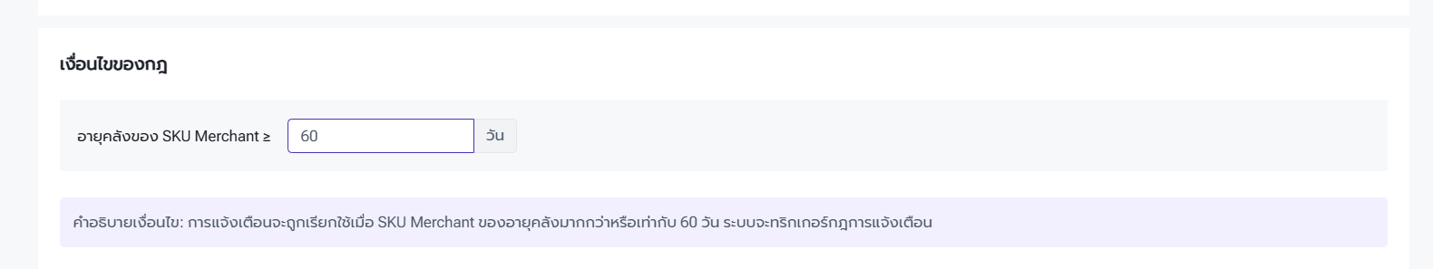 3)หากผู้ใช้งานเปิดใช้งานฟีเจอร์ “การจัดการล็อตสินค้า”สามารถตั้งค่าการแจ้งเตือนอายุคลังได้ โดยกำหนดจำนวนวันของอายุคลังสำหรับการแจ้งเตือน ตัวอย่าง: หากตั้งค่า “อายุคลังของ SKU Merchant” ≥ 60 วัน เมื่อ SKU Merchant มีสต็อกคงเหลืออยู่ในคลังสินค้าเป็นระยะเวลาเท่ากับหรือมากกว่า 60 วัน ระบบจะส่งข้อความแจ้งเตือน