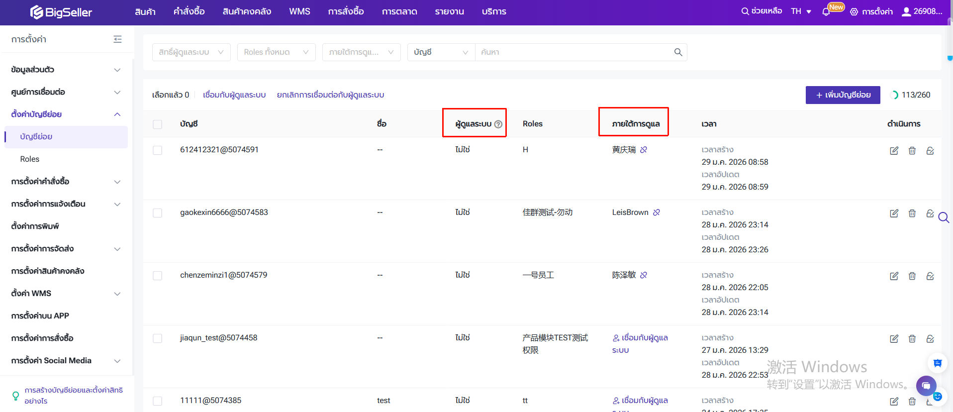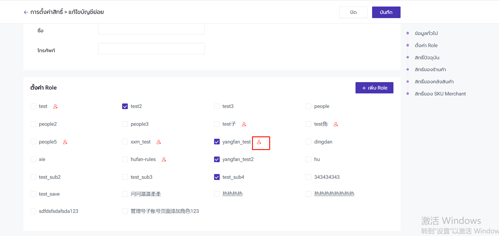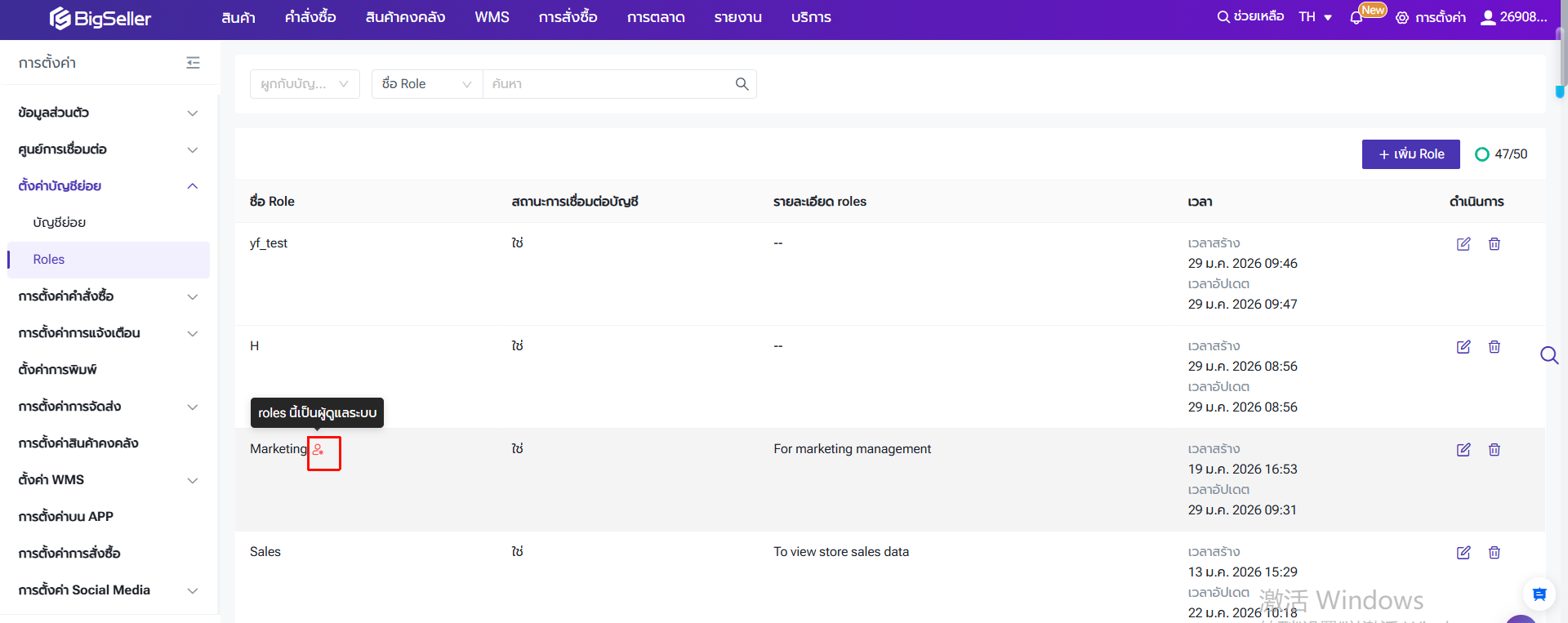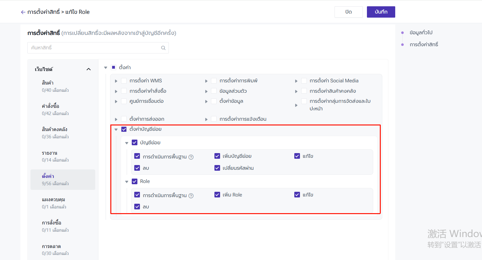 ไปยังหน้า "การตั้งค่า" > "ตั้งค่าบัญชีย่อย" > Roles > เพิ่ม/แก้ไข Roles
