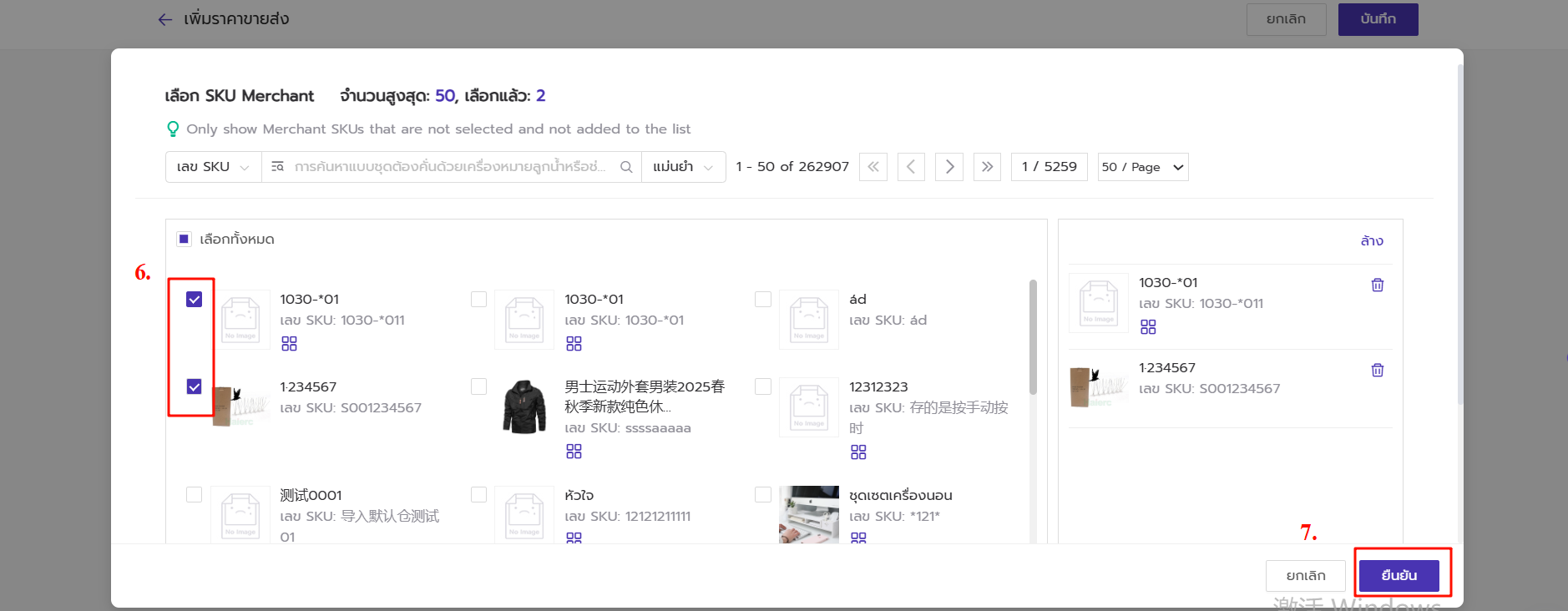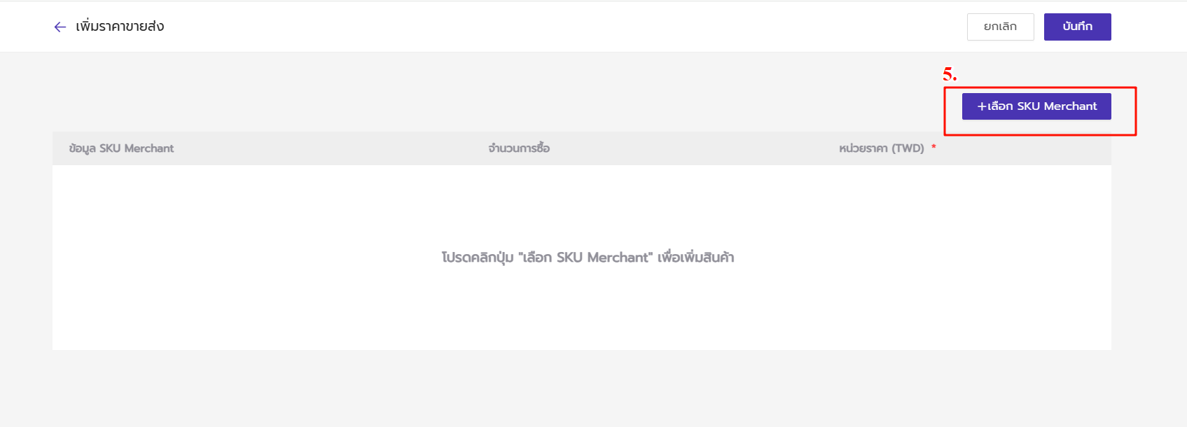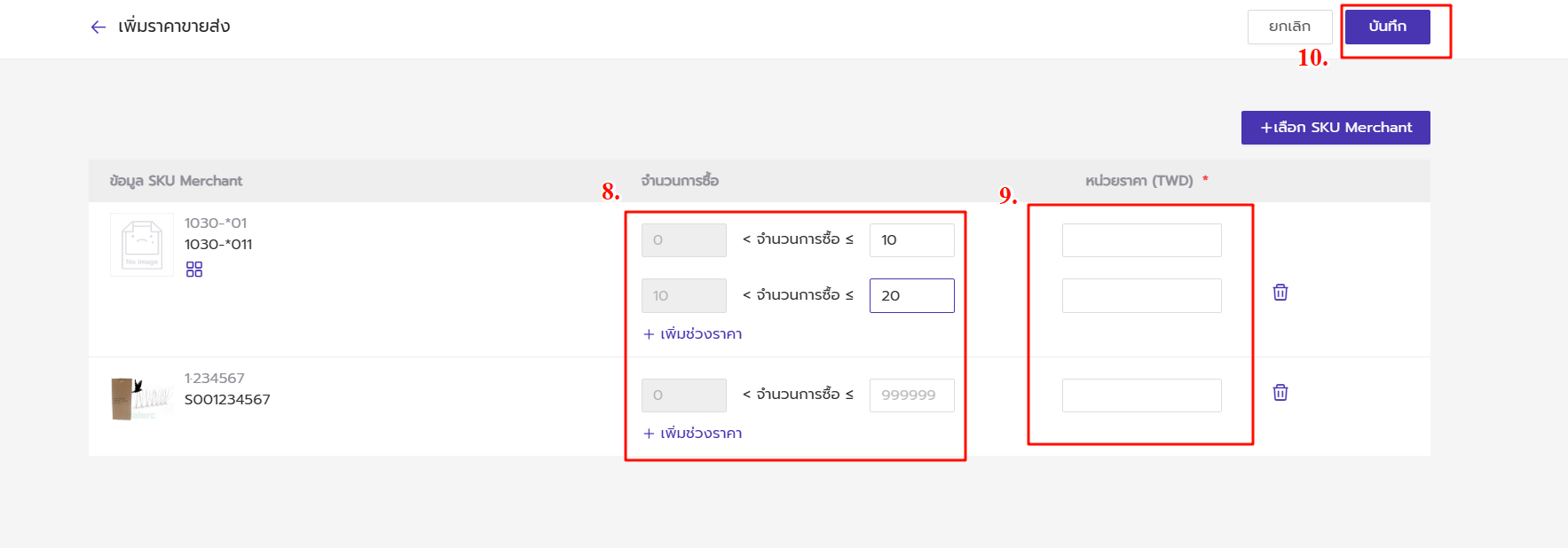 กรอกช่วงจำนวนการซื้อและราคาขายส่งของ SKU Merchant