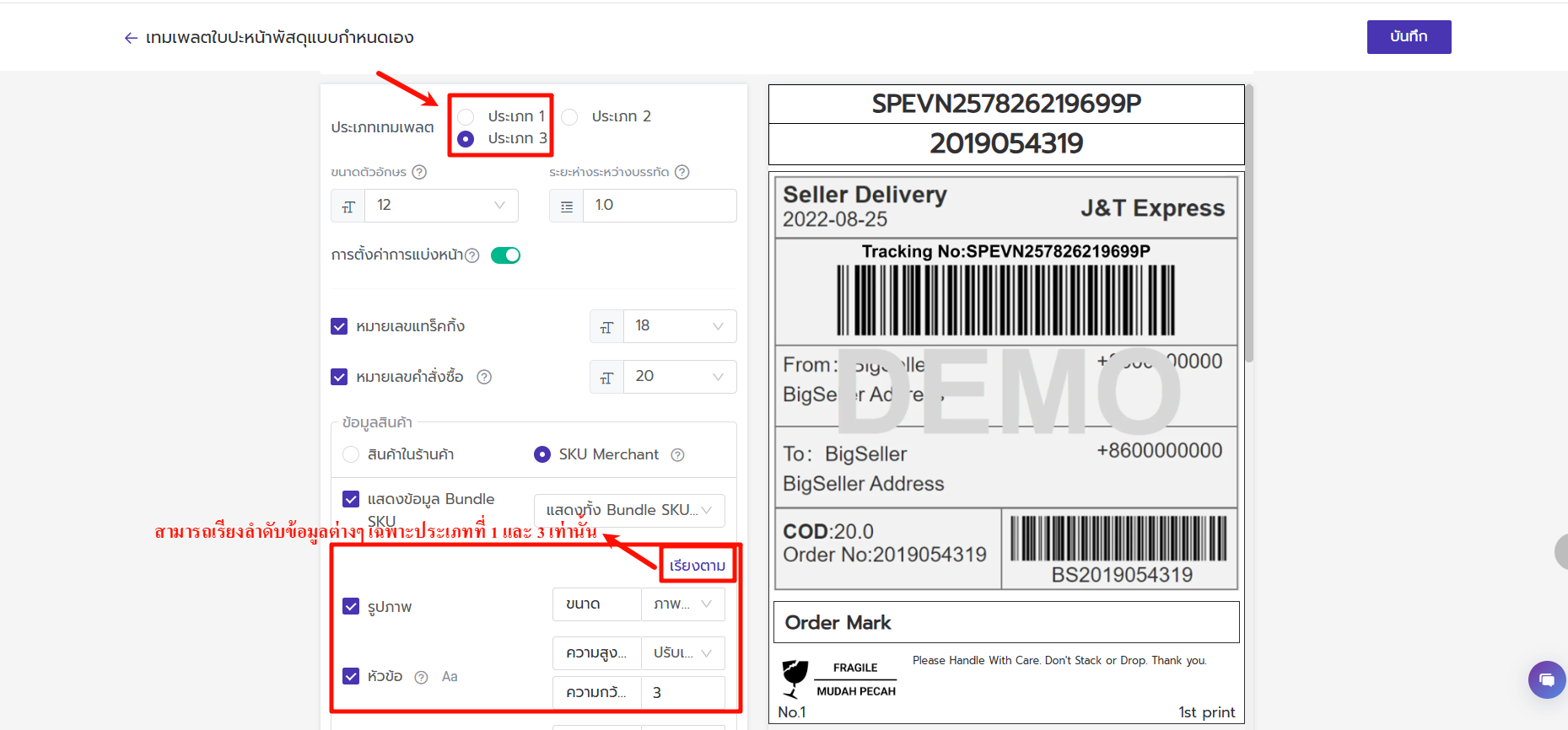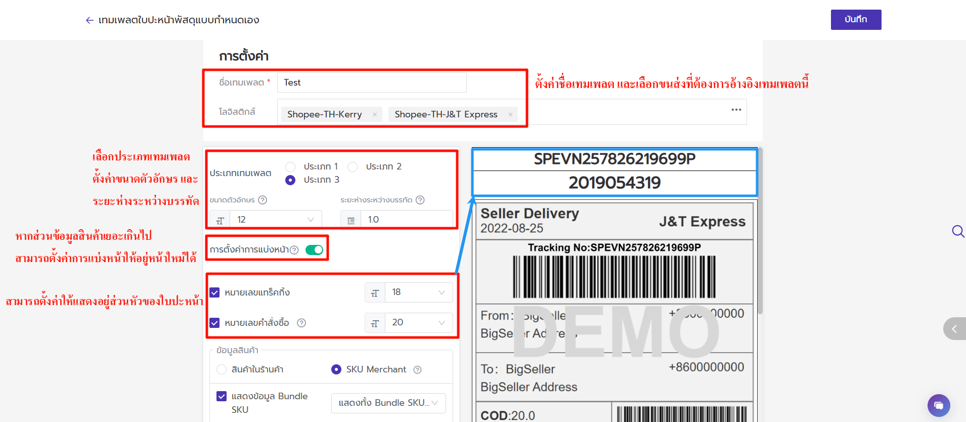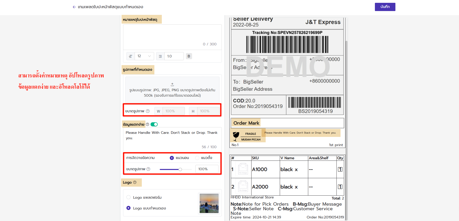 1. การใช้ใบปะหน้าพัสดุแบบกำหนดเอง สามารถเพิ่มข้อมูลเฉพาะบนใบปะหน้าพัสดุตามความต้องการ เช่น ข้อมูล SKU ร้านค้า/SKU Merchant จำนวนการพิมพ์ การแจ้งเตือนการแกะกล่อง การแจ้งเตือนแตกง่าย และ Logo ร้านค้า ฯลฯ เพื่อเพิ่มเอกลักษณ์ส่วนตัวร้านค้า2. สามารถตรวจสอบความถูกต้องของสินค้าได้อีกครั้งบนใบปะหน้าพัสดุก่อนจัดส่ง